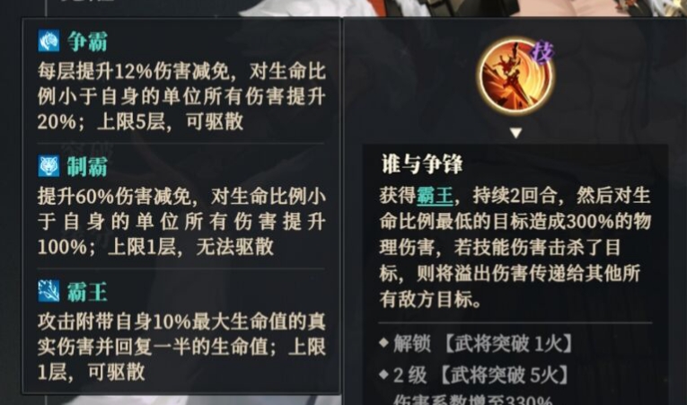 ⭐另外【谁与争锋】伤害会为什么会这么高的原因也离不开【制霸】和【霸王】效果。①制霸:可以提升60%伤害减免和对生命比例小于自身的目标伤害提升100%。