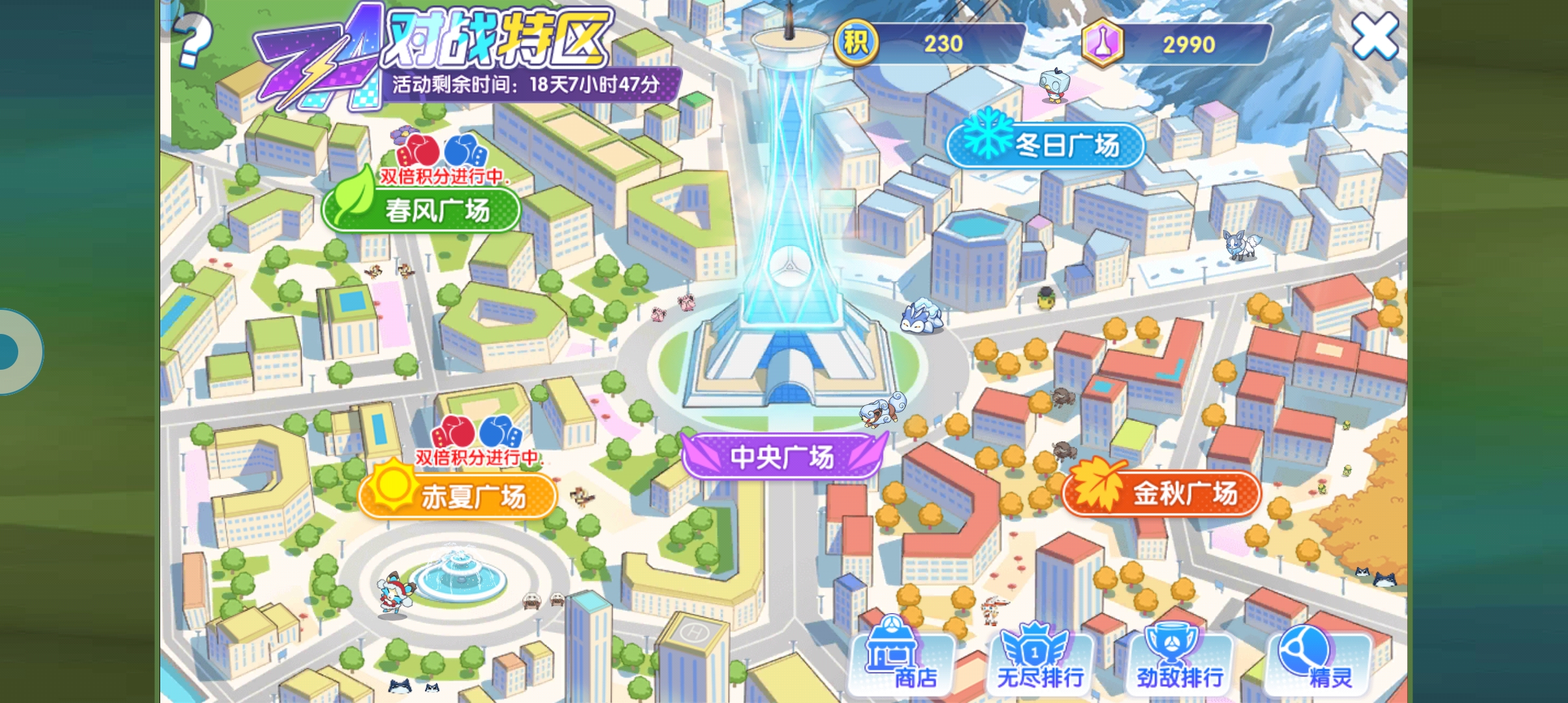 我们可以随便给我们的初始精灵学习技能,然后前去挑战双倍积分地区然后去打NPC,然后获取NPC的精灵即可,一开始我还以为这个玩法是PVP活动,但我想错了这纯粹就是一个pve活动,完全都是打人机,三个人机一个真人,也就是我们自己,互相大乱斗一天一共是五次挑战NPC的机会,上方图中画测试服一样,我是一个中央地区和四个分区,中央地区是无尽模式,是可以一直挑战下去的,直到你被打败,然后重新刷新参与这个玩法,就可以获得培养点数,所以前期给的初始3000点数可以随便用,用完之后可以把培养好的精灵在中央地区进行挑战,获得第一名就可以获得300点数的培养值