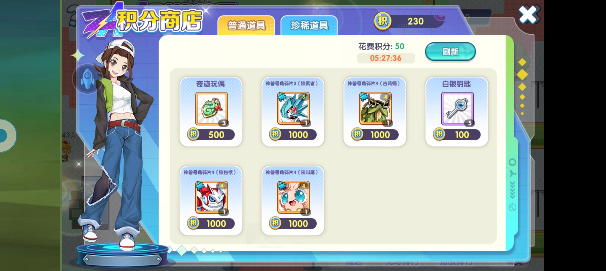 商店这边的话,拥有两个兑换点,一个是普通道具,这里面可以可以随机刷新出来,培养资源和一些神兽的号角碎片,但是这些神兽都是无法超进化的,但是有一个比较的例外,就是龙柱子如果有一些玩家想赌未来的话,可以考虑选择一个自己喜欢的精灵去刷他的碎片等以后闪光形态加强了,普通形态也可以顺带超进化一下,但是我更推荐的还是去兑换培养材料,特别是突破特训这一类的