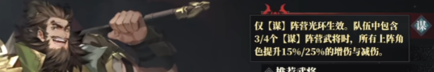 仅谋光环生效,上阵3名谋阵营角色激活1级羁绊的15%增减伤,上阵4名谋阵营角色激活2级羁绊的25%增减伤。