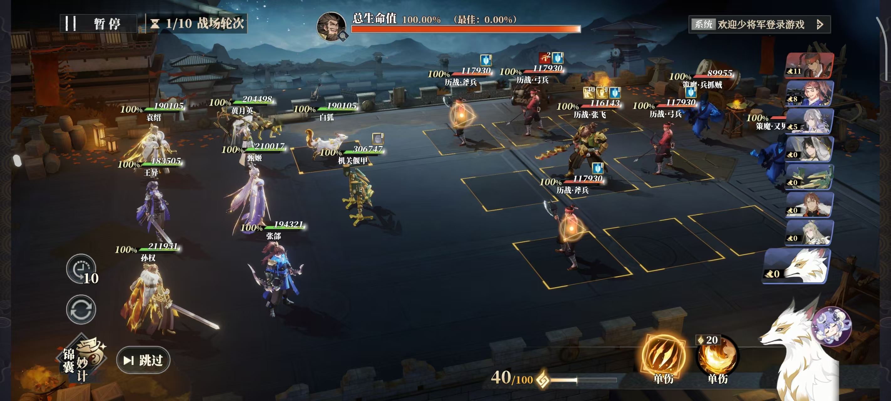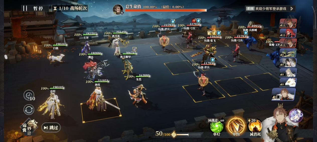 孙权全程绝技拉条王异(王异行动条为下个顺位时,可以使用通用技或普攻,避免拉条浪费)→