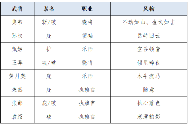 ③尽可能多配备执旗官职业武将:如袁绍、张郃、朱然等。执旗官具备游戏内特有的绝技团队全体拉条机制,释放绝技可以使输出位的王异打出更多伤害。