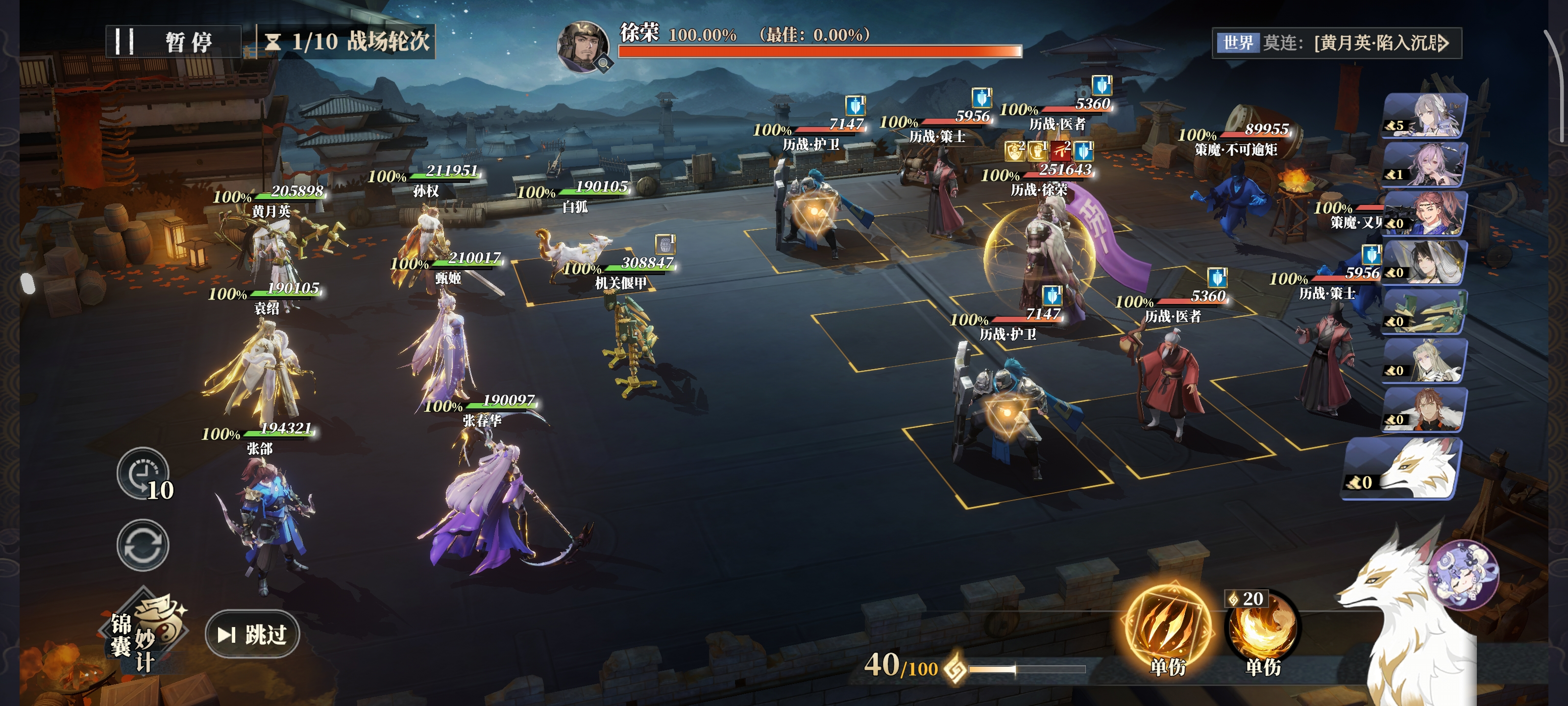 孙权全程绝技拉条张春华(张春华行动条为下个顺位时,可以使用通用技或普攻,避免拉条浪费)→