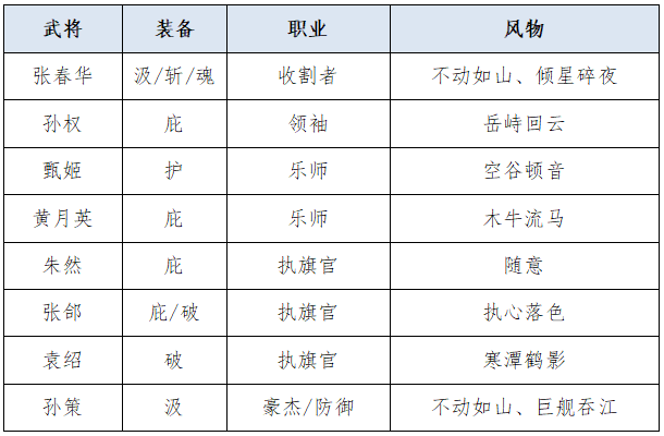 ③尽量多配备执旗官职业武将:如张郃、袁绍、朱然等。执旗官具备游戏内特有的绝技团队全体拉条机制,释放绝技可以使输出位的张春华打出更多伤害。