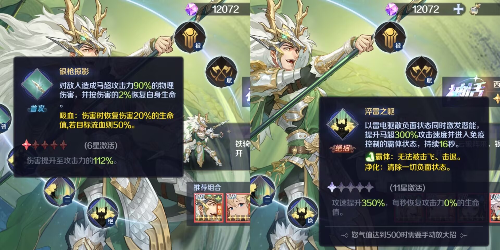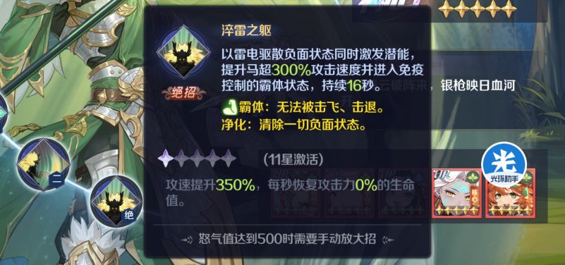 并且霸体状态下马超无法被任何技能击飞或者击退,11星以后马超攻速提升还解锁了新回血能力。
