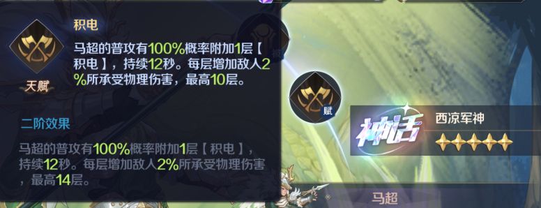 ②天赋:能够让马超普攻附带【积电】效果,每层积电基础可以让敌人受到的物理伤害提升2%最大可以叠加10层=20%物理伤害增加。