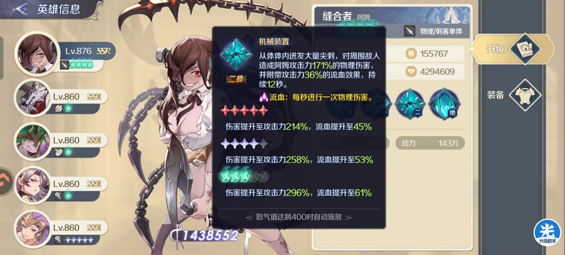 ④缝合者:好用升星容易的输出,可以优先靠近后排输出同时给敌人挂流血,让马超的普攻的吸血可以达到最大化。
