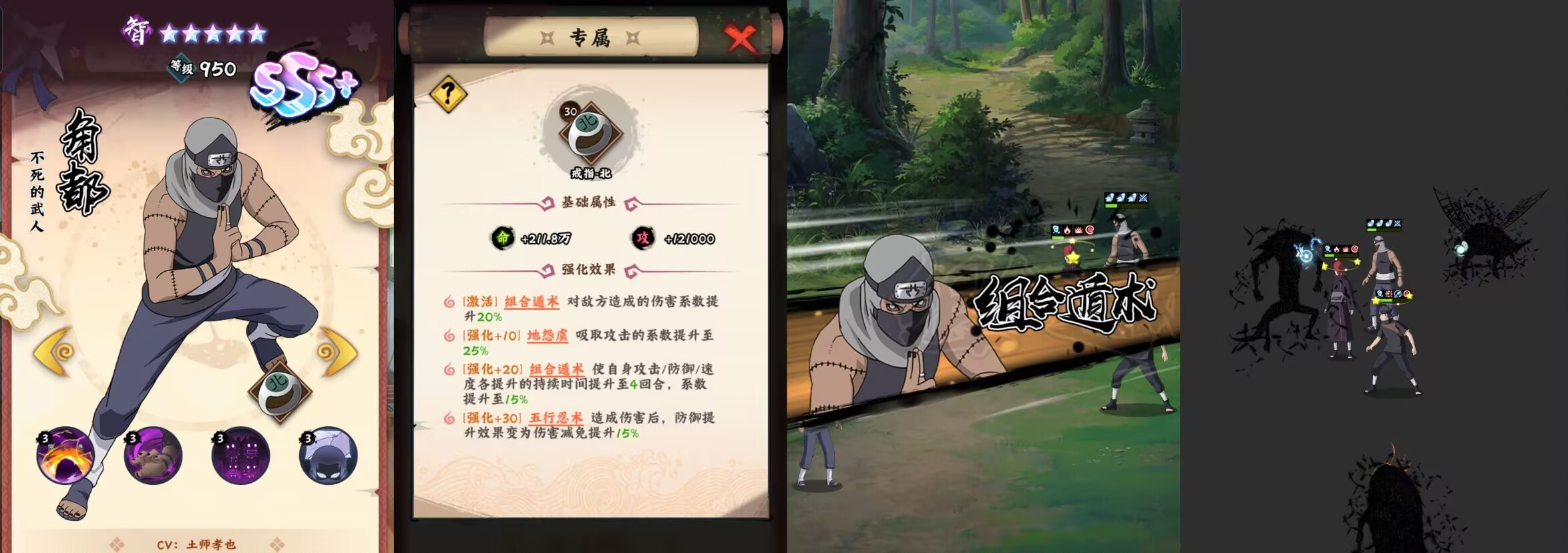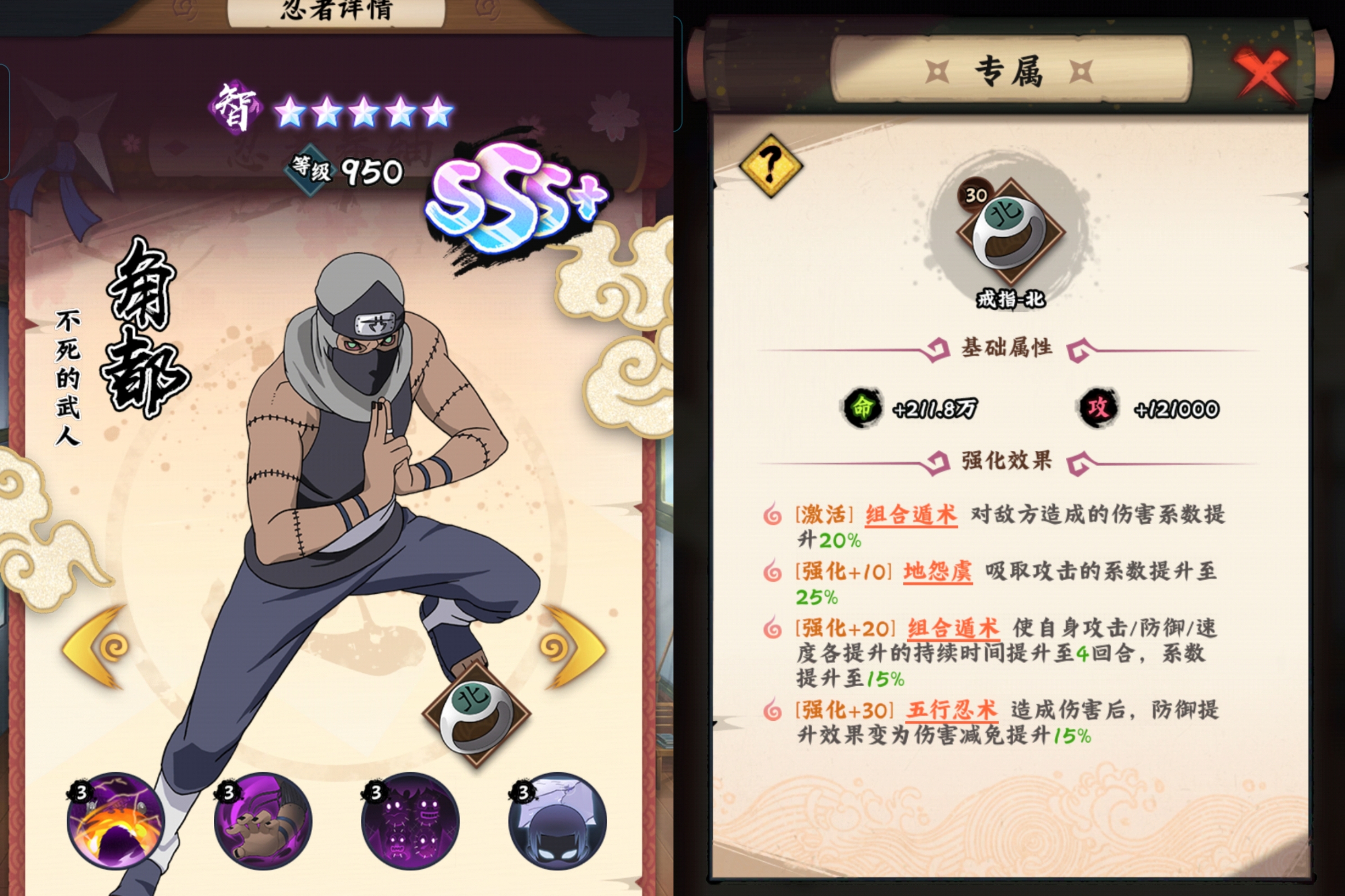 总结:角都不太吃专属等级,不像有些忍者一定要30级专属才有质变,10级20级的专属就能够充分发挥出角都的实力,这也是角都的优点之一。