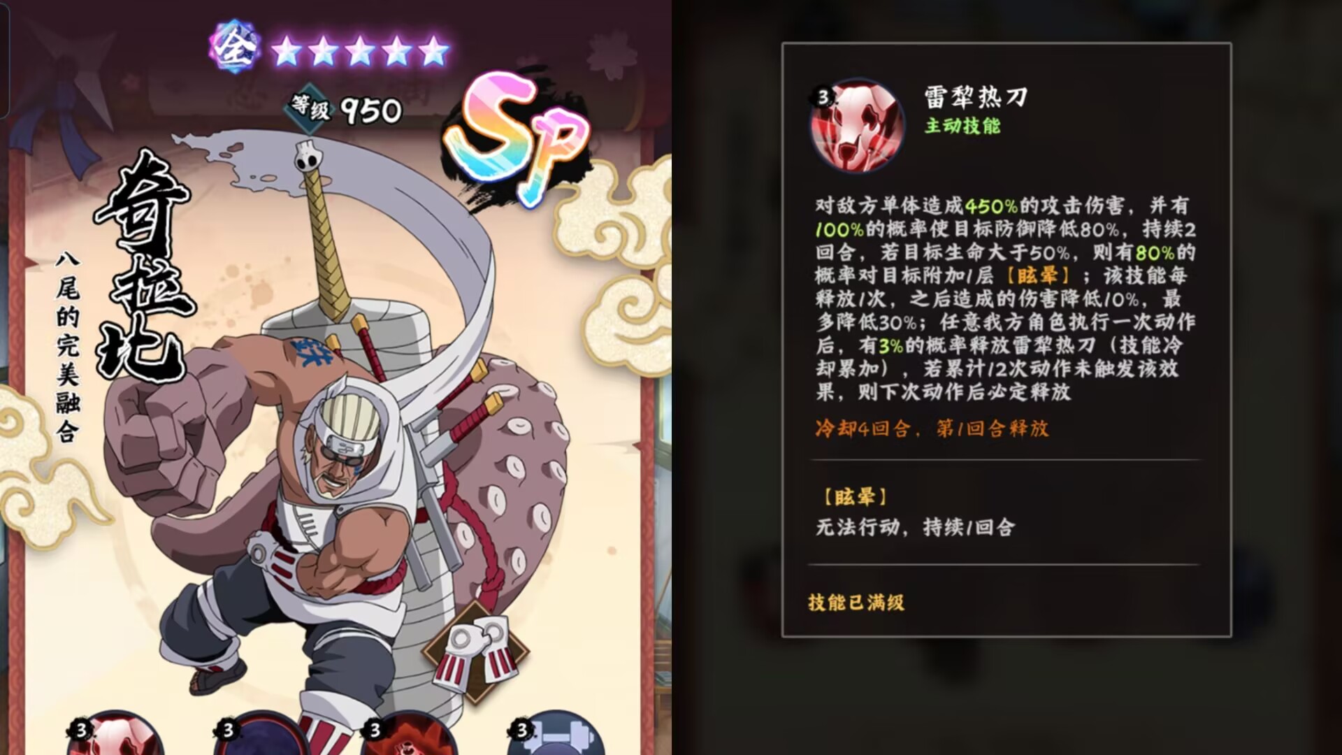 自身机制有很高的防御和抗暴加成和护盾加成属于能抗能打的忍者,最大的优点在于【执行动作】可以靠队友的行动来触发【雷犁热刀】打伤害。