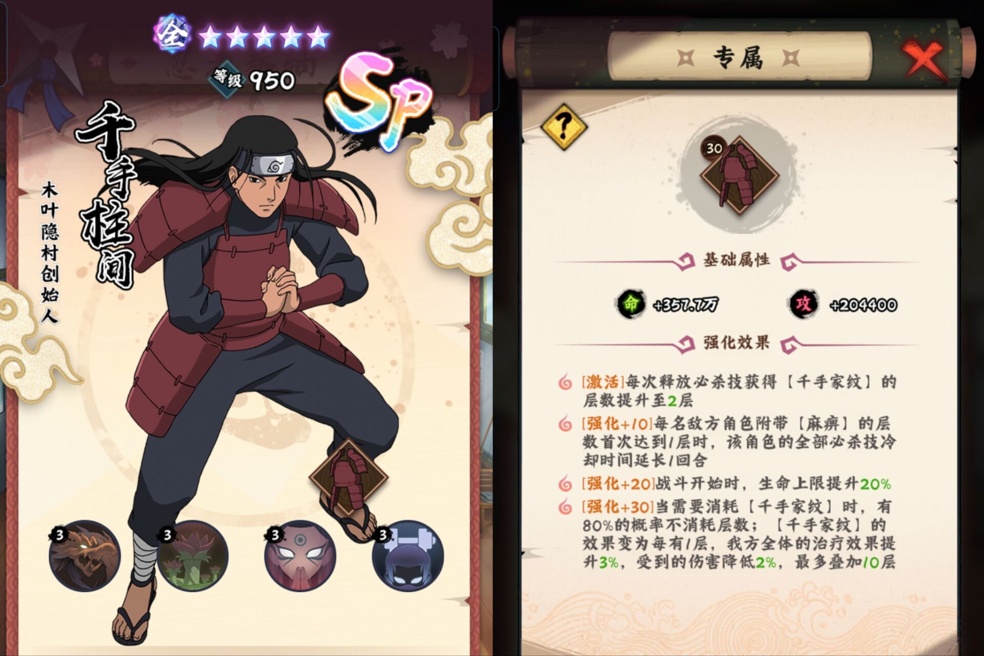 比较吃专属等级:专属30级以后消耗【千手家纹】有80%概率不消耗,那么就可以让柱间维持技能强度。