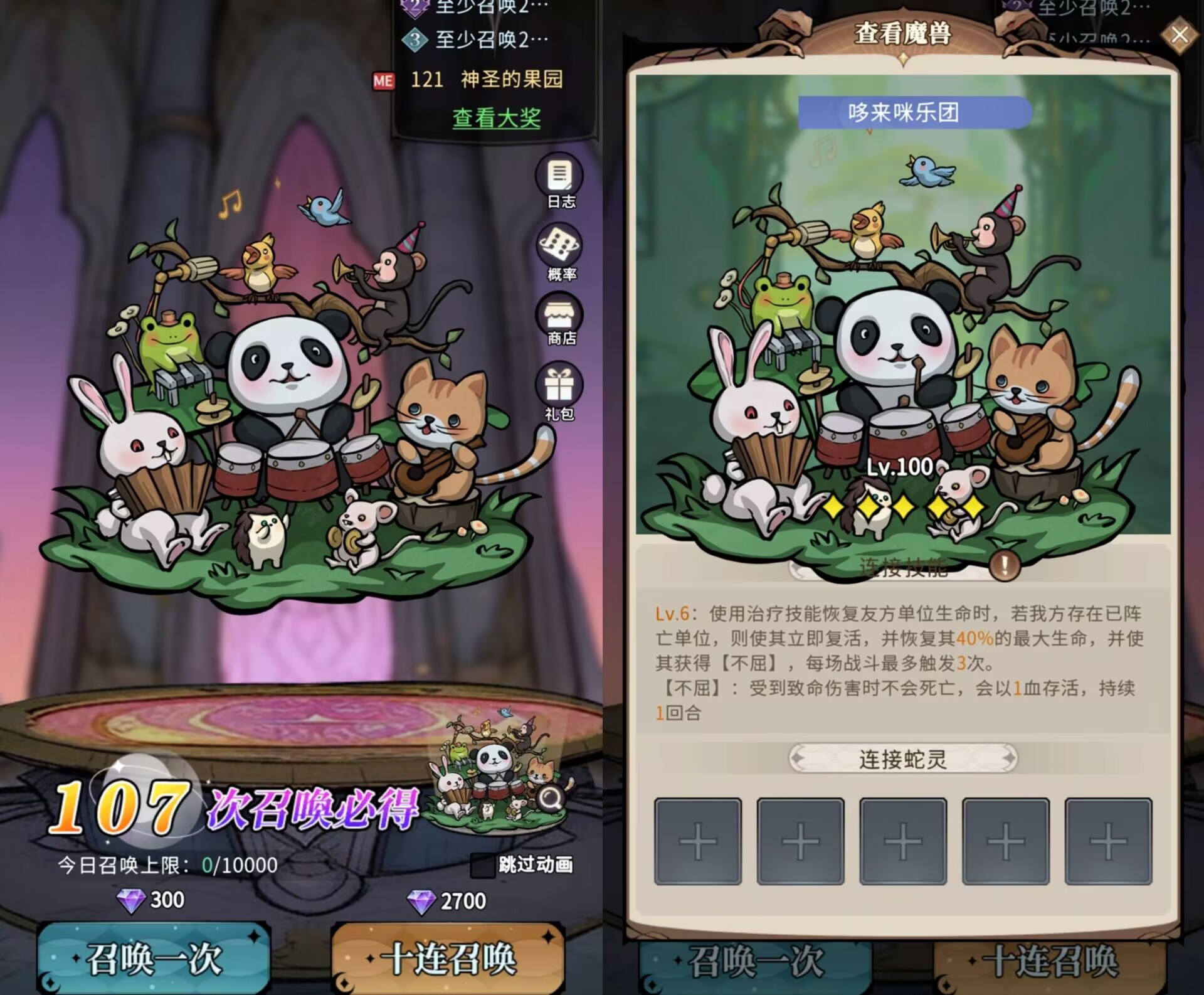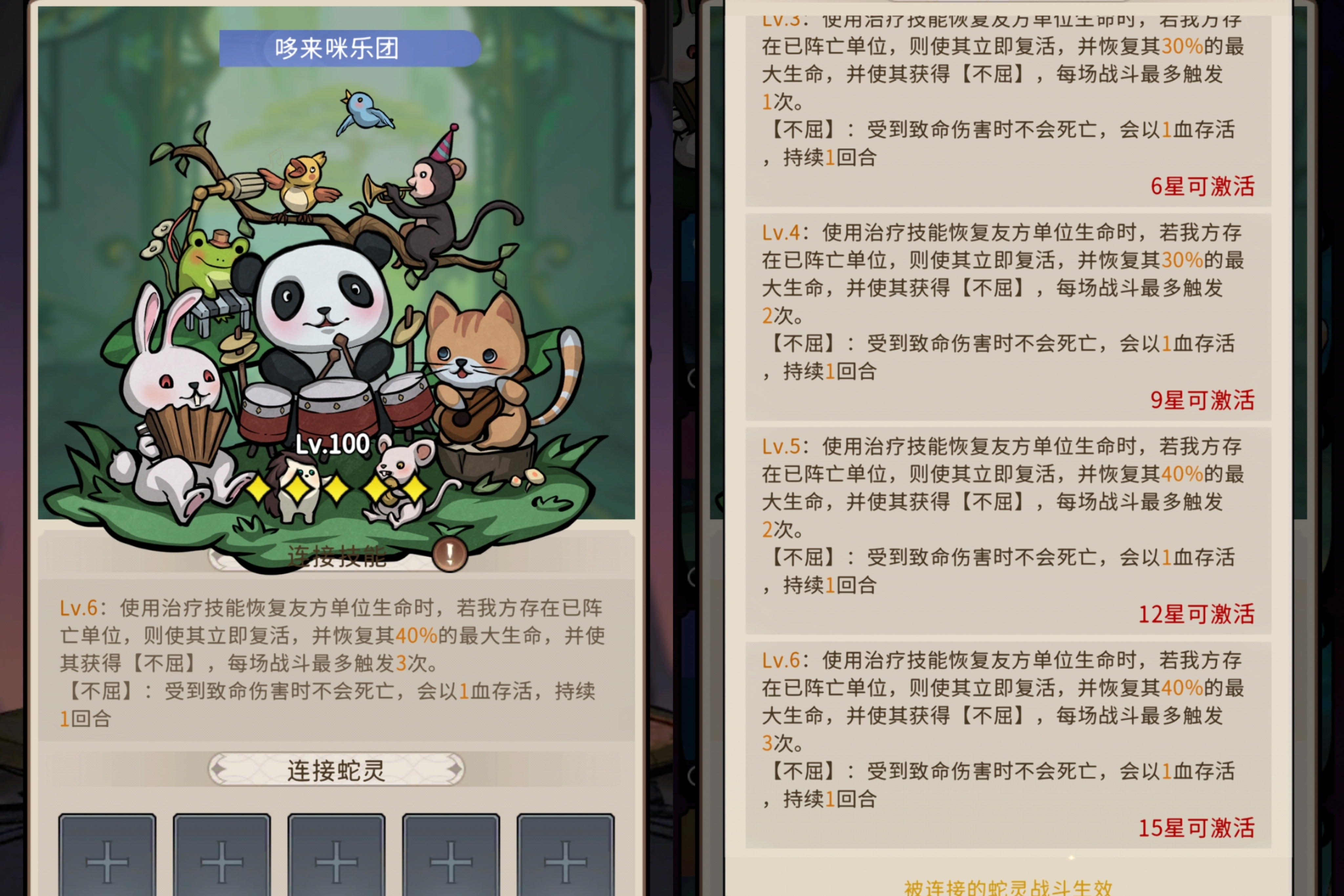 ①总体来看首个【幻彩魔兽:哆来咪乐团】有能力的大佬是非常值得去拉的,可以提高队伍的复活效率还有不屈1回合的免死保命,极大提升了队伍的容错率和反打能力,非常适合所有奶妈去佩戴的神兽。