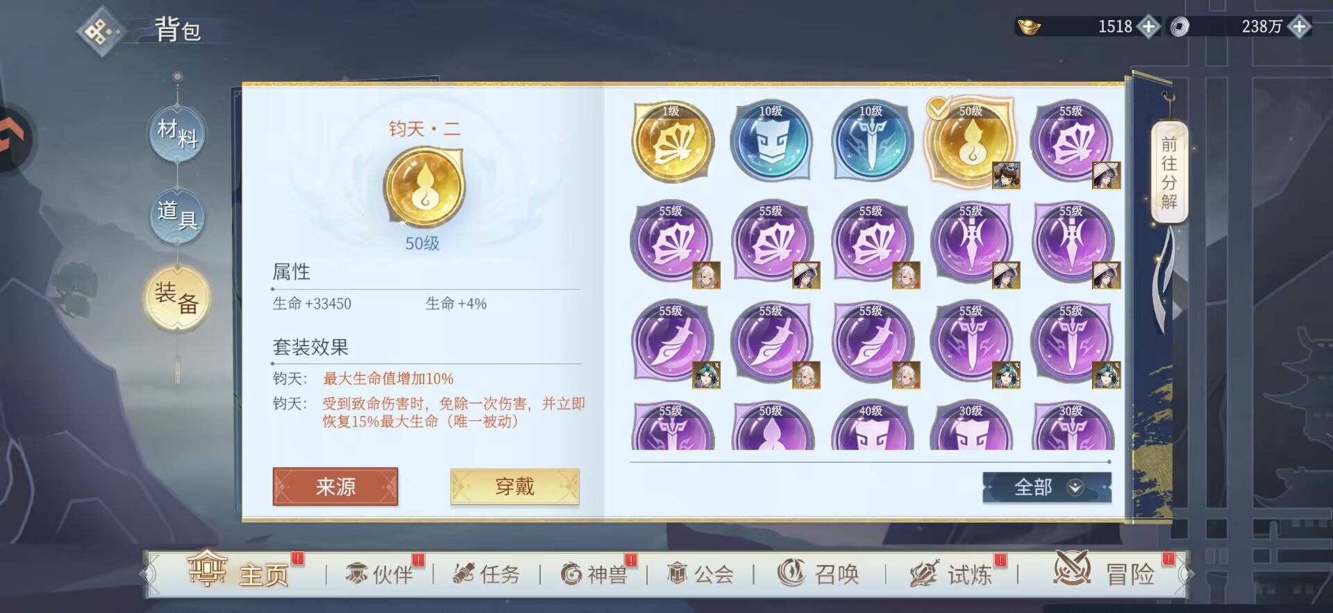 打完所有的装备试炼以后,可以做2件随机橙装狮子出了1件【断霄】和1件【钧天】。