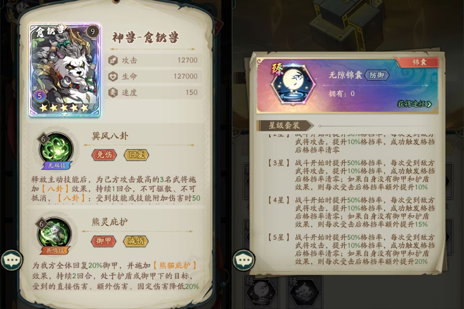 ③另外这个妖灵让狮子想到了【熊猫】和【无隙锦囊】的关系,熊猫和无隙锦囊是提升格挡概率的。