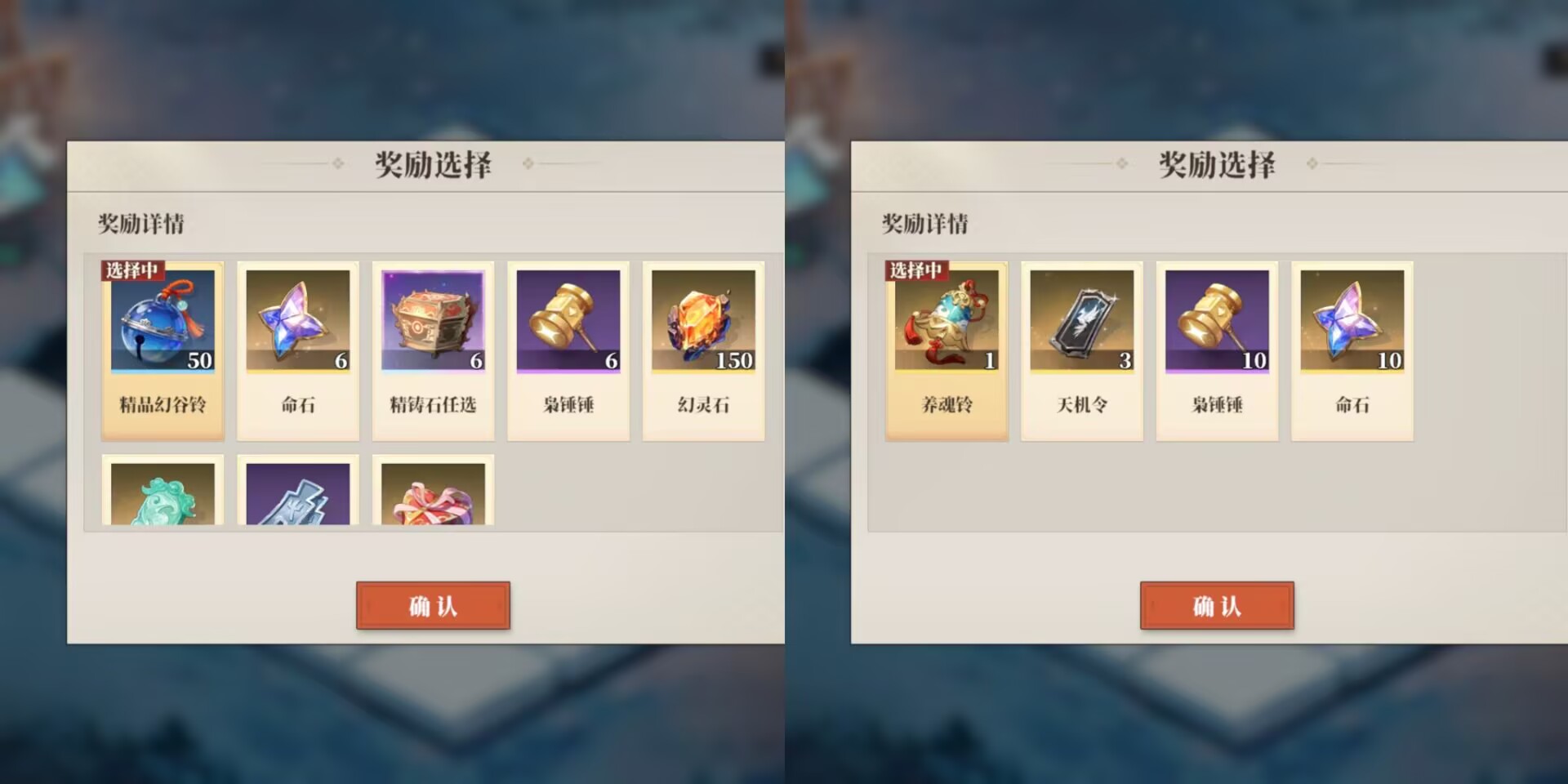 这两个是最好的奖励了其他的奖励都排不上号老区的玩家可以考虑把【养魂铃】换成:命石,因为老区的玩家角色很多都是拉满了。