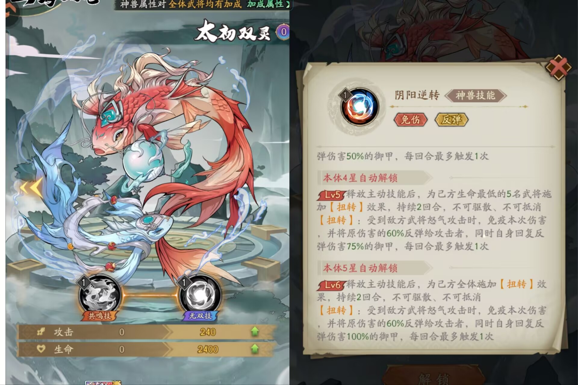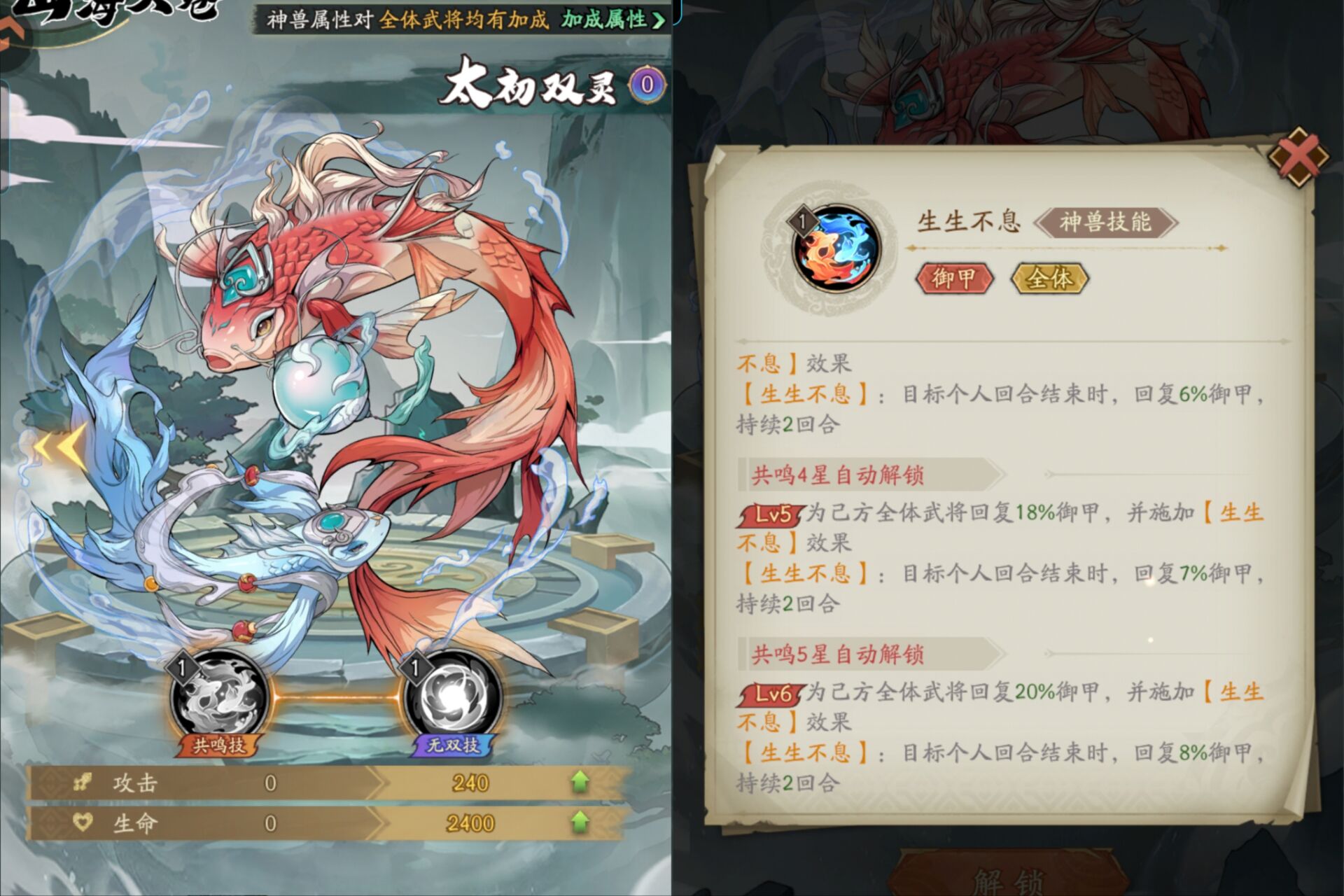 太初双灵属于提升生存的神兽可以给全体武将回御甲和抵挡伤害,技能机制本身没有太大的问题,但是效率很差,具体原因狮子上面也说了,所以强度很差。