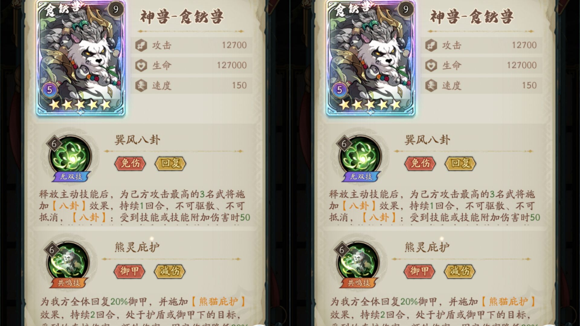 新神兽的共鸣技和【熊猫】一样给我方全体武将回复20%御甲,然后有2回合的额外回复御甲的效果。