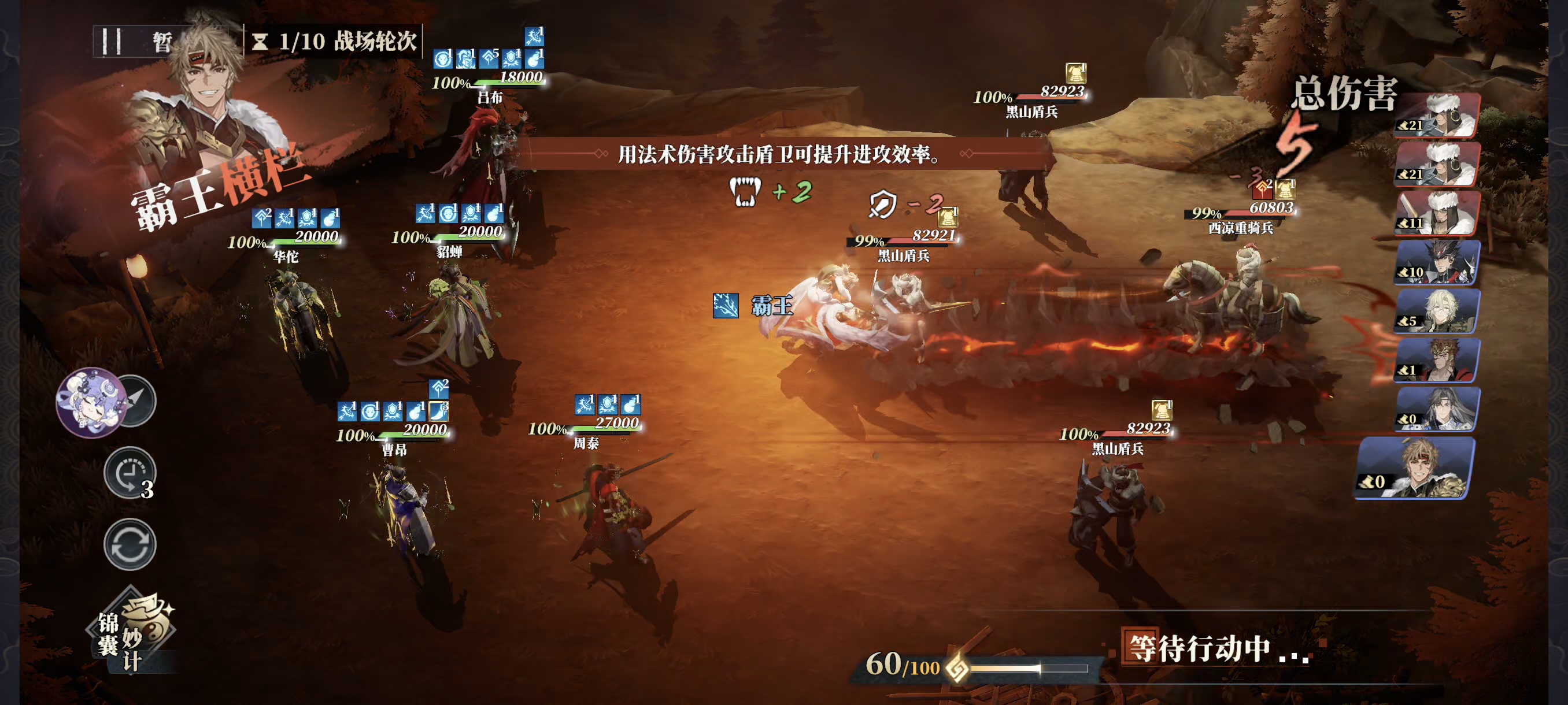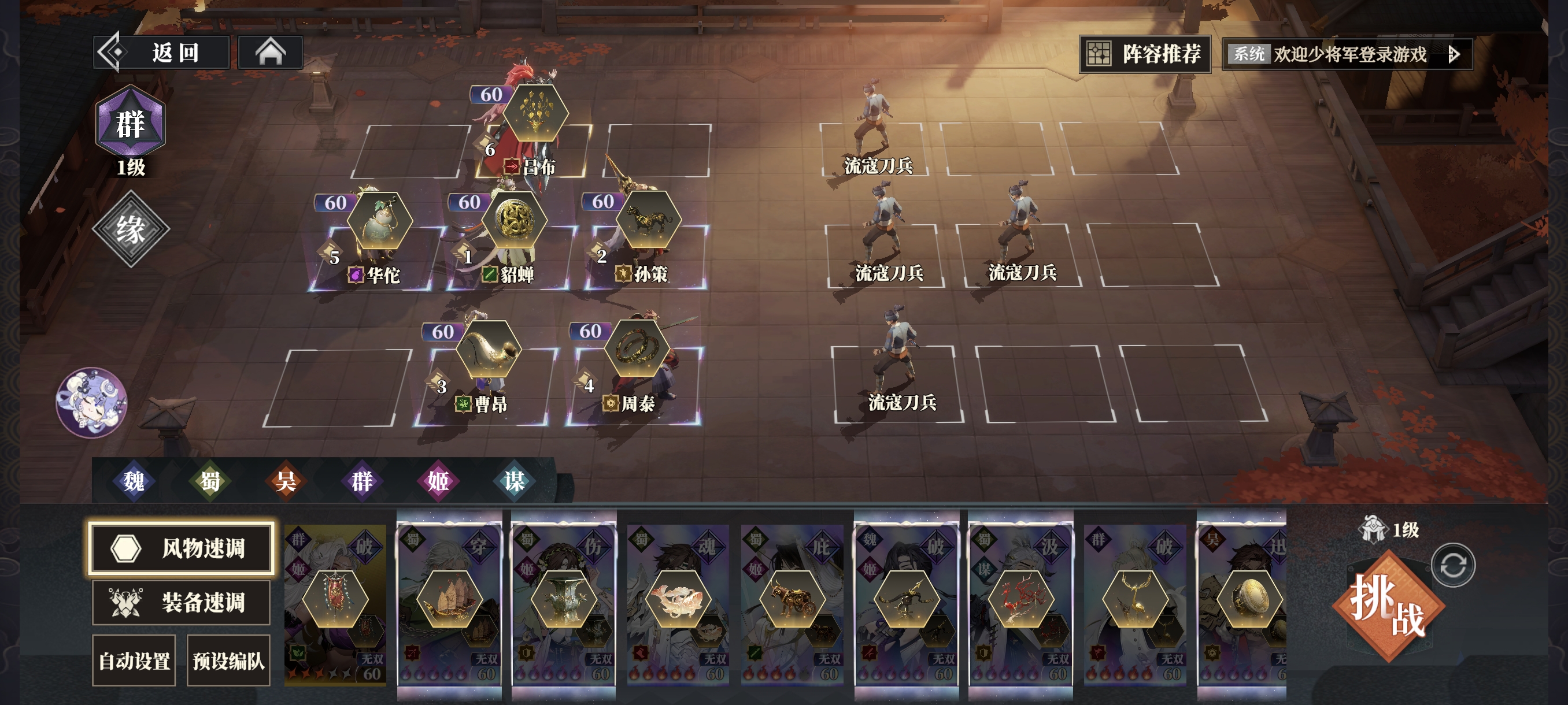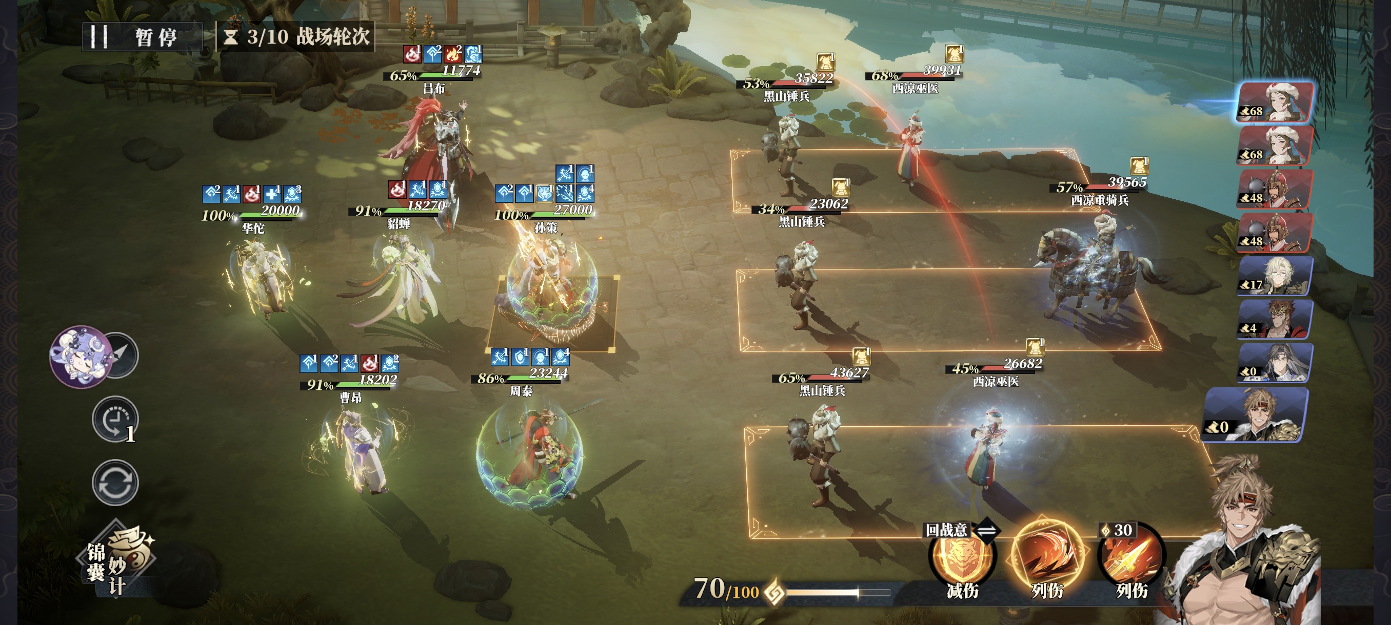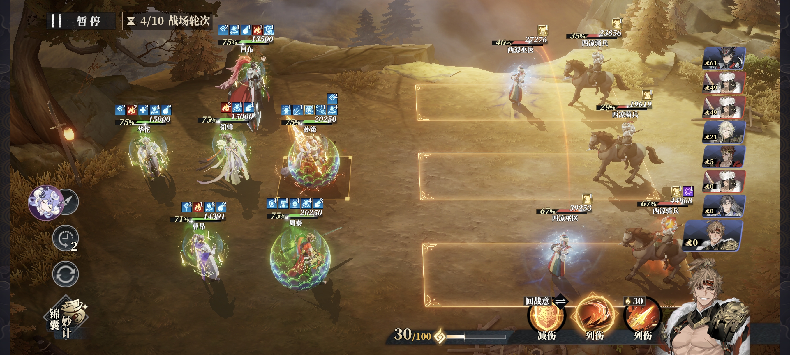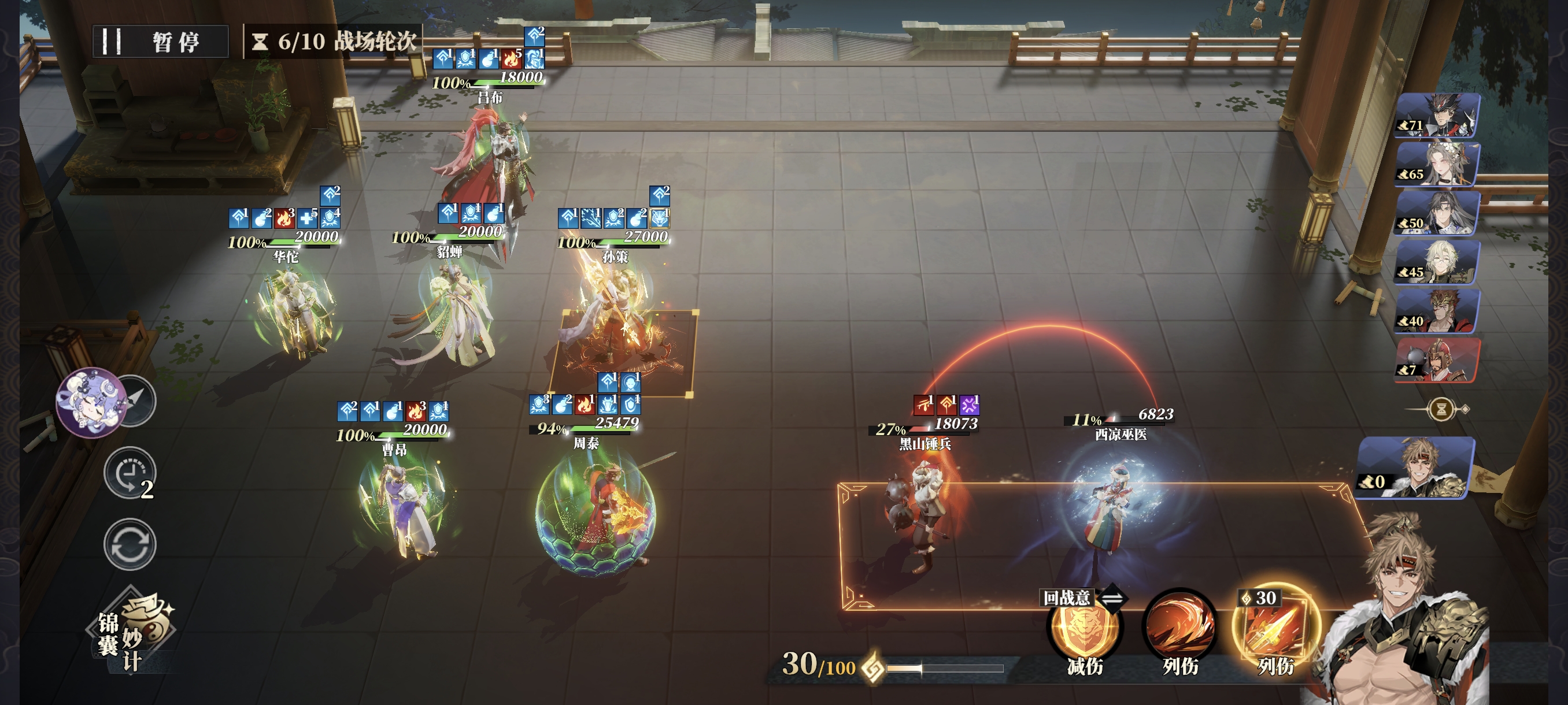 孙策30+华佗30+吕布40=100战意触发火石,其他人全程普攻即可。