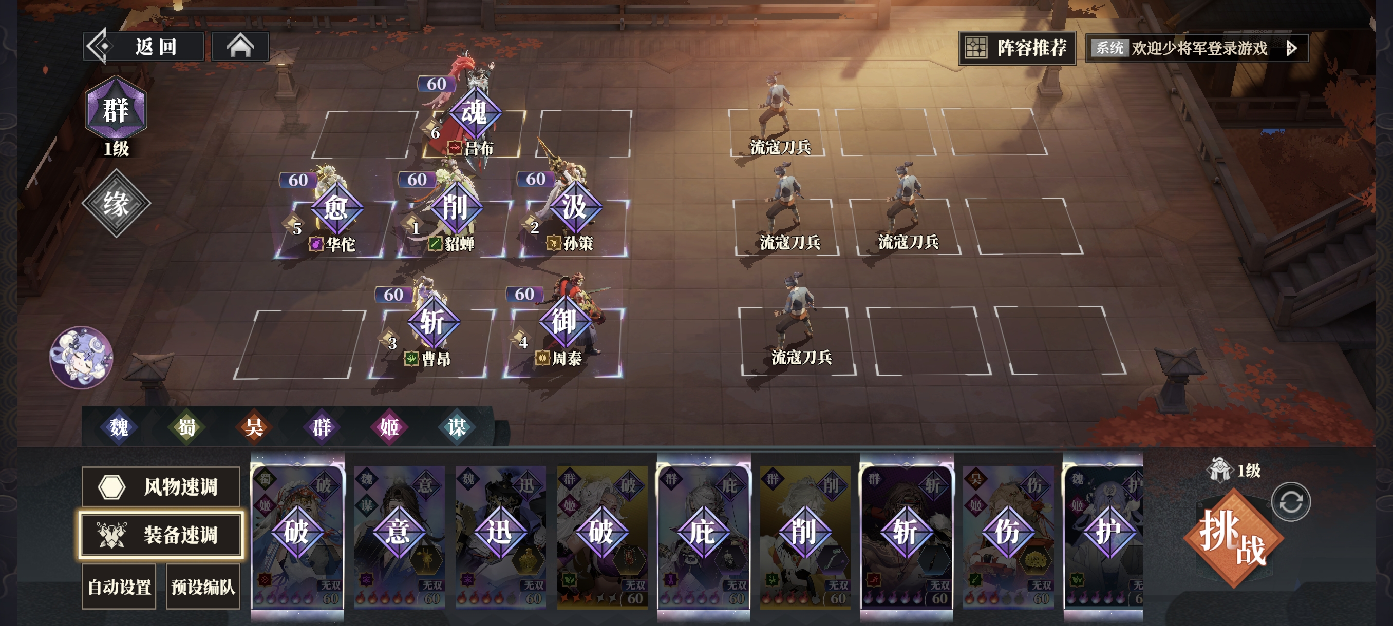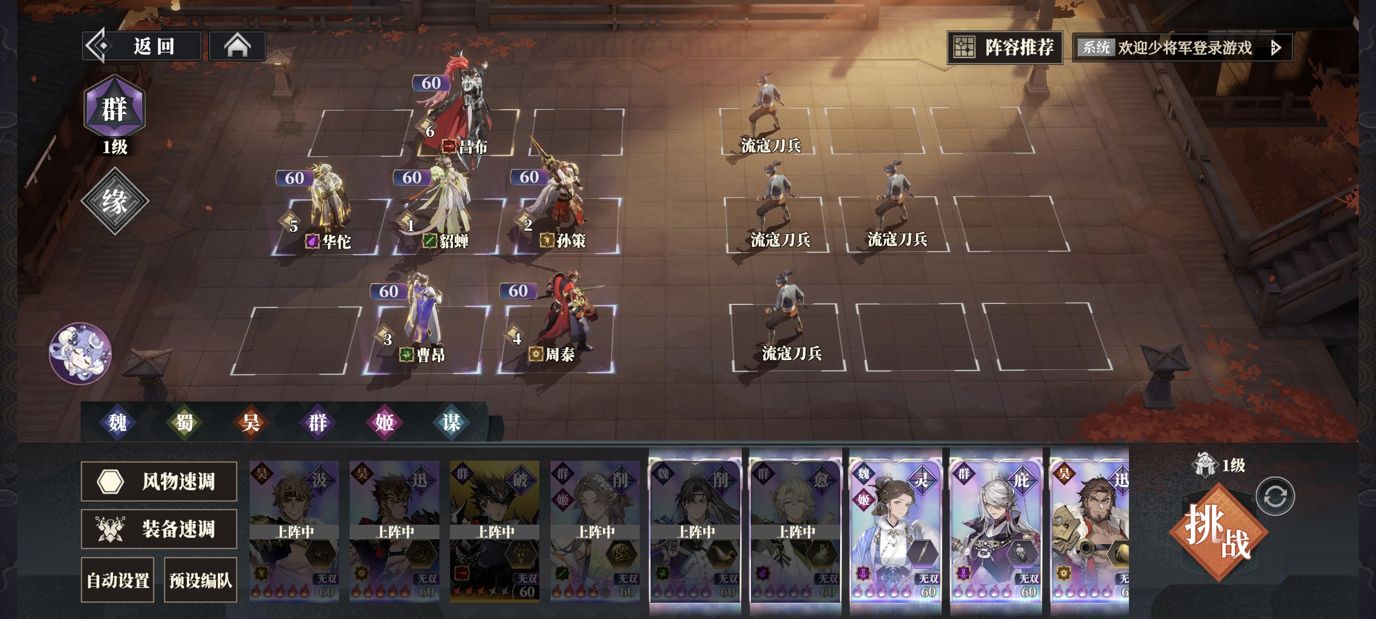 前三关无卡点,每轮的100点战意全部消耗完即可,触发火石后通过孙策+将军邀战进行一轮输出,依次循环就能通关。