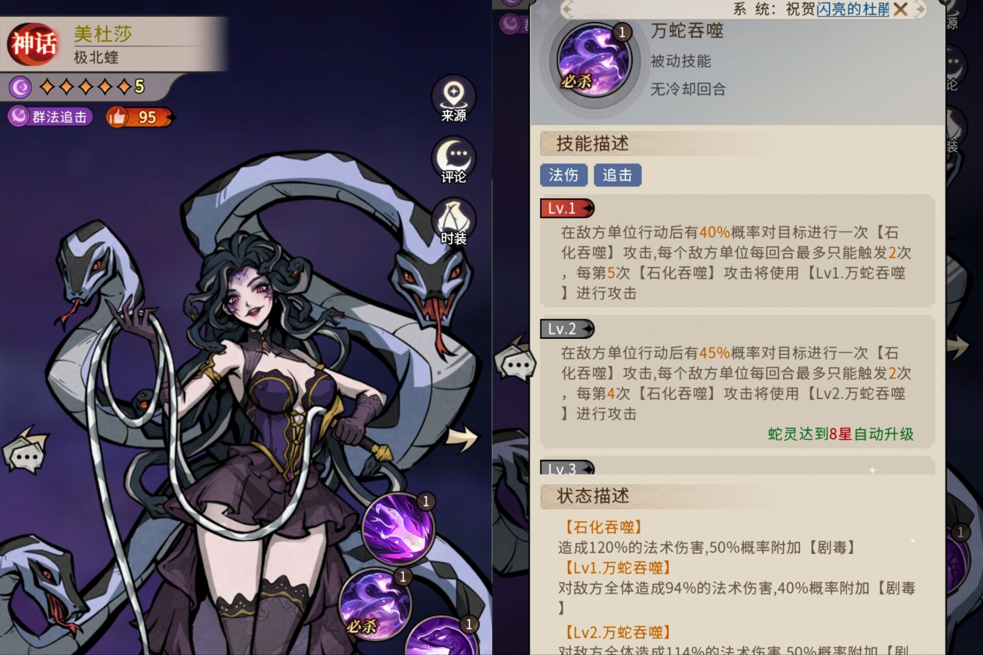 如果觉得阵容有【小小白雪】【蛇灵小青】不缺收割追击伤害了,也可以考虑培养先培养美杜莎。