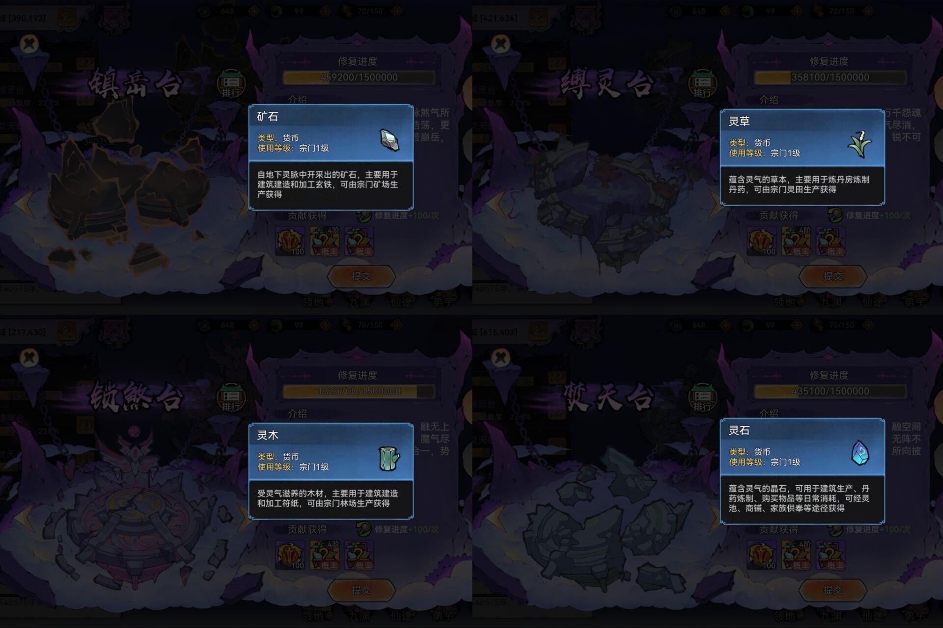 一般情况下目前最不缺的就是:灵木和灵矿,而灵石和灵草我们比较缺。