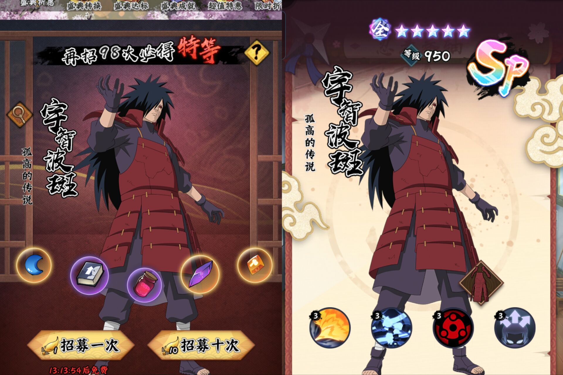 四:最后总结:①一句话概括就是前面没有抽过:sp佐助、sp八尾的平民玩家,斑爷是非常推荐大家抽的。