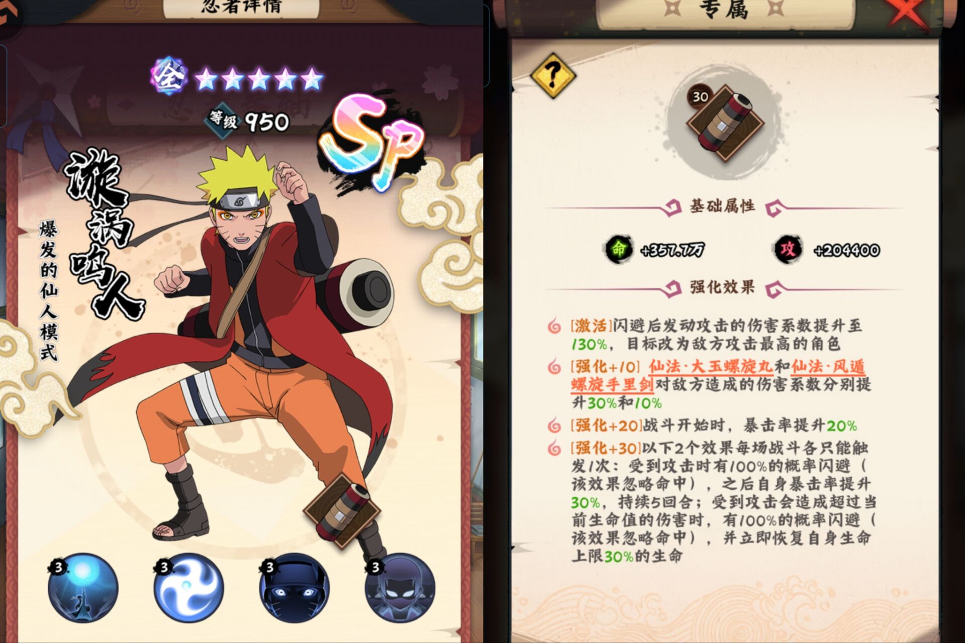 ①仙鸣:顶级的sp忍者,生存和输出都在线,高闪避和高伤害配合斑反打能力拉满,斑可以全方面削弱敌人的伤害,鸣人反打能力极强,同战力可起到扭转战局的的结果,而且仙鸣互相配合aoe伤害直接爆炸,仙鸣还可以补充队伍的对单伤害,两者互相配合强强联手输出伤害拉满。