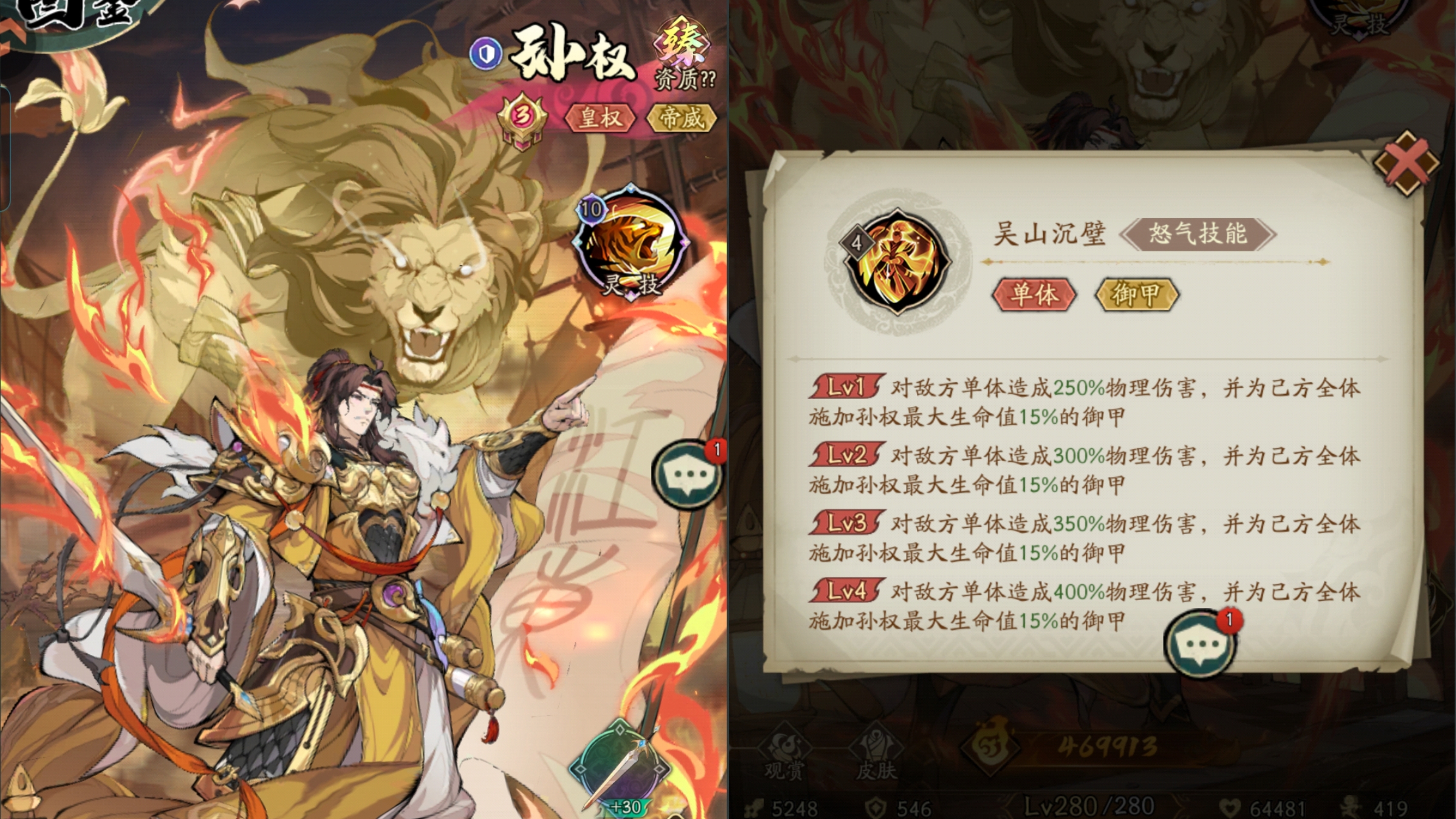 孙权的怒气技能机制为:单体输出+御甲保护。