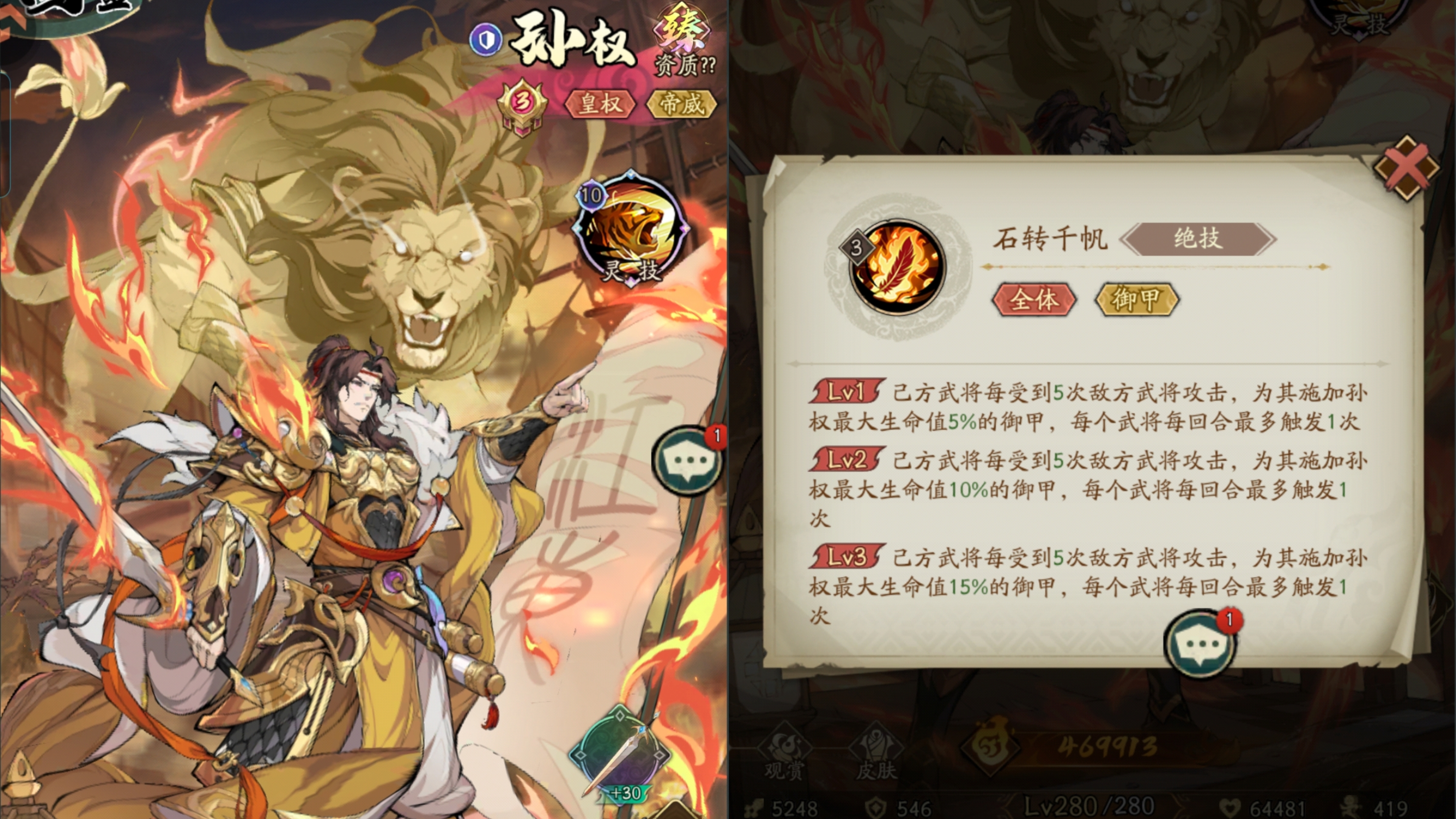 10级的孙权能够偷取敌方武将的5%最大生命用于给自身转换御甲,同时每回合可以给被记录伤害达到50%的队友施加守护。
