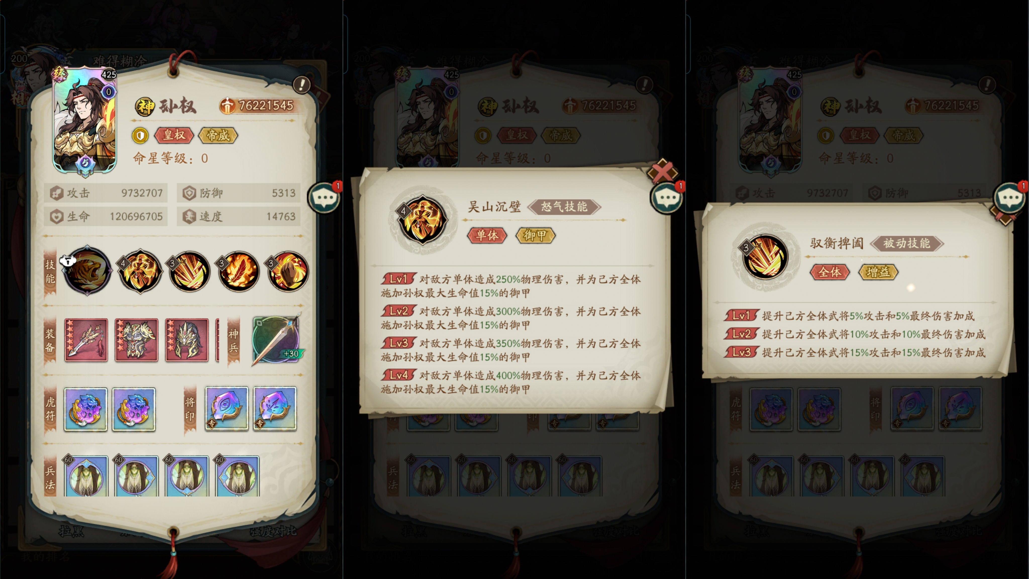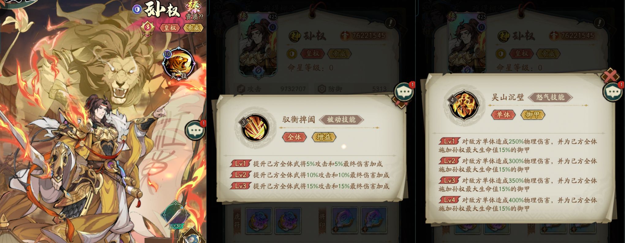 全面提升我方的输出能力,特别是对肉队的玩家这点伤害的提升帮助也是比较大的,而且04灵技的孙权可以给全体队友加【帝威】。