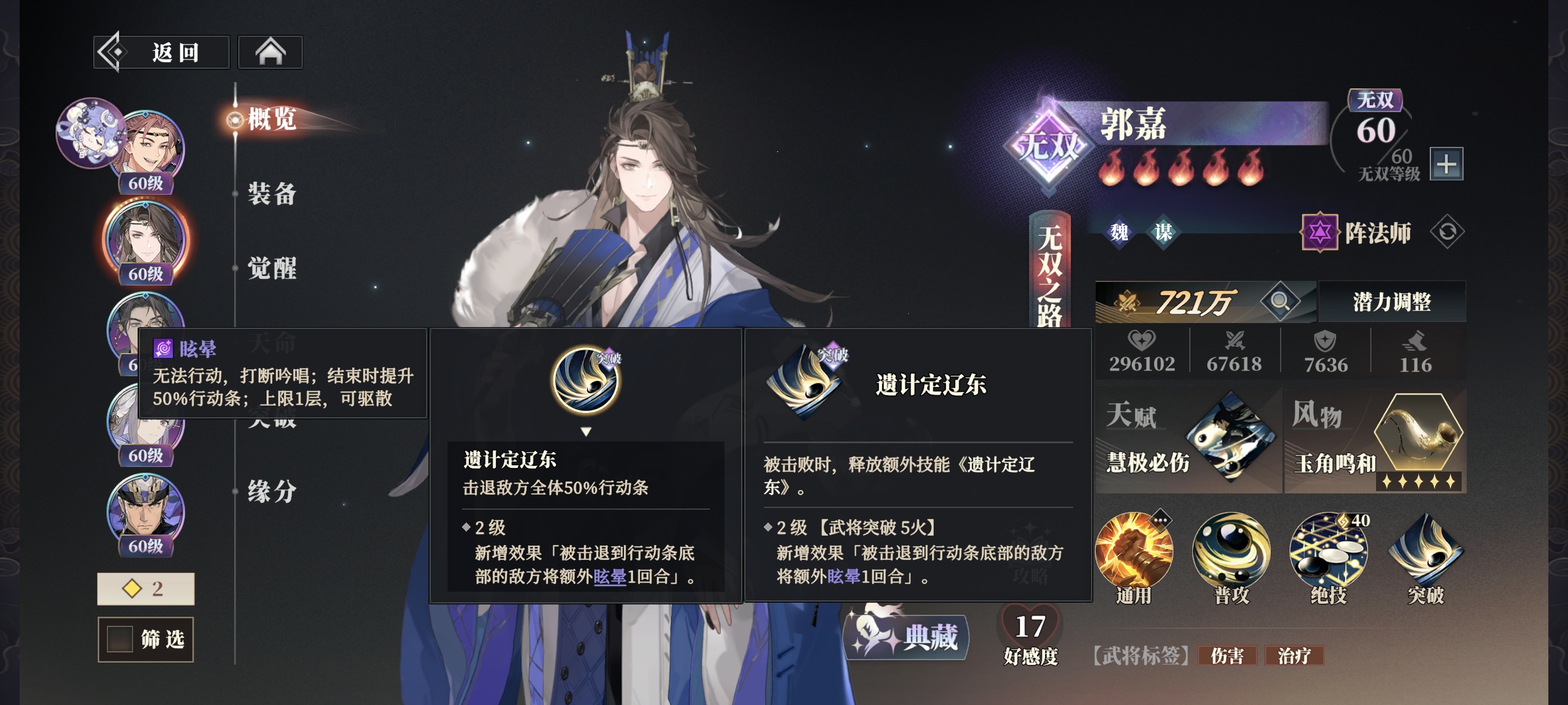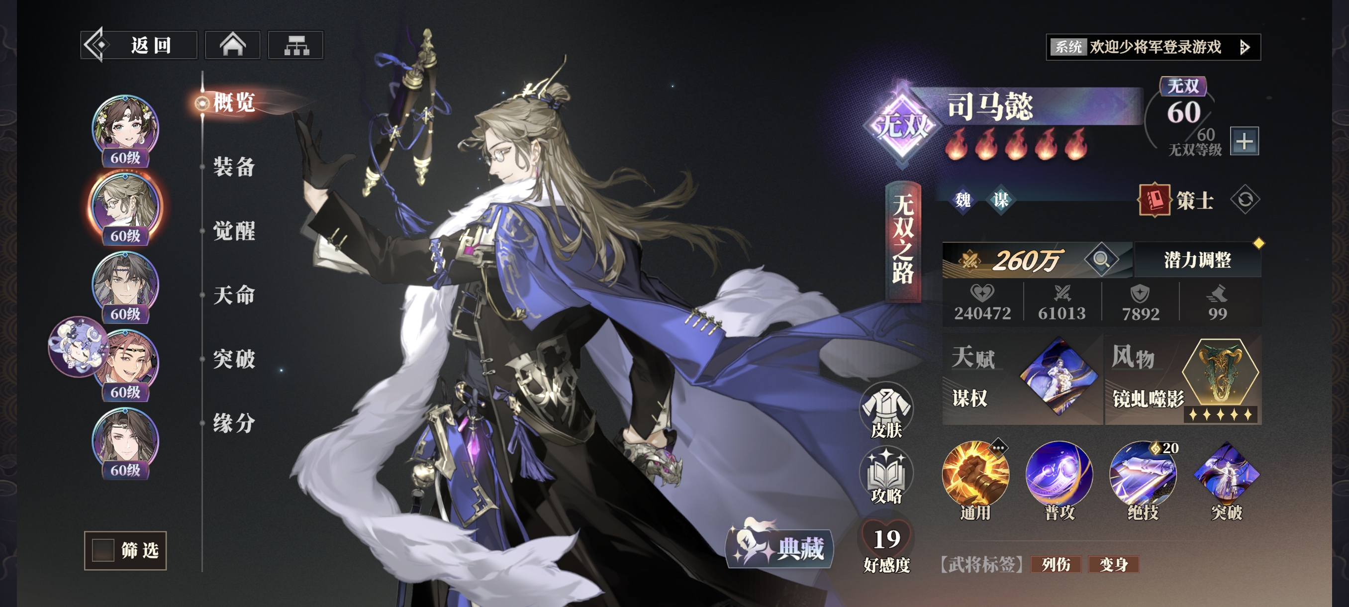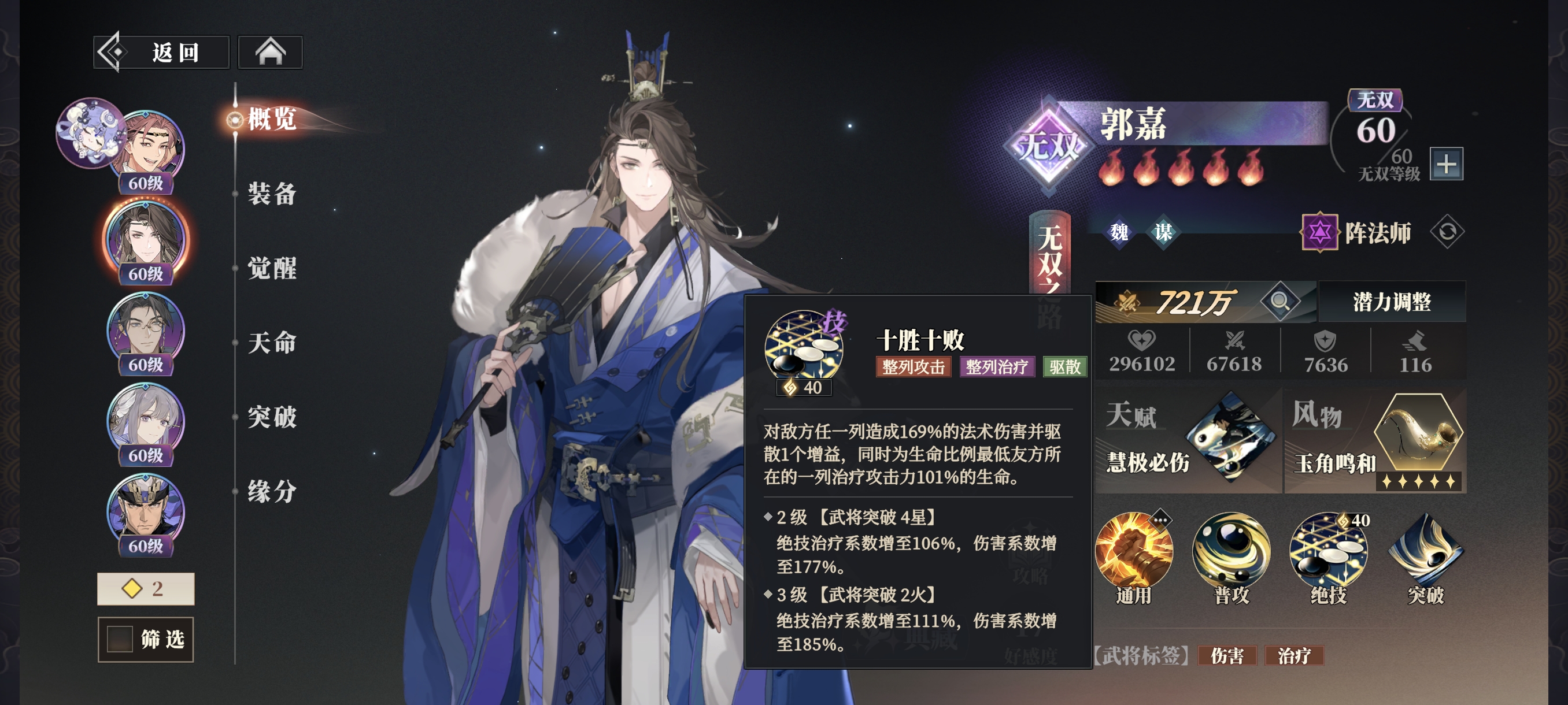 二、缘分分析司马懿的缘分【算无遗策】相对较为鸡肋,所提升的法伤需要绝技治疗为前提,三人中仅有郭嘉的绝技可以治疗且郭嘉绝技开场消耗太高,整体叠加太慢。