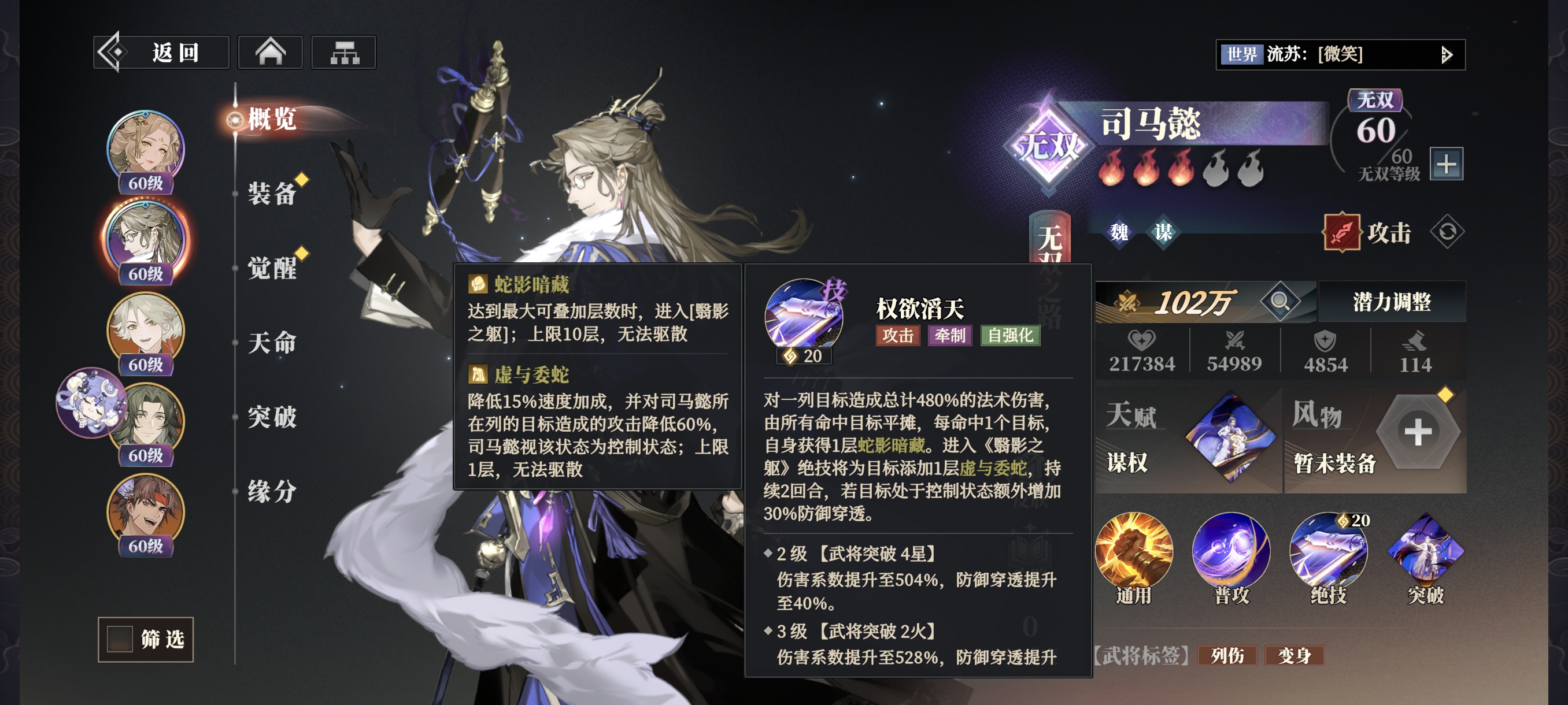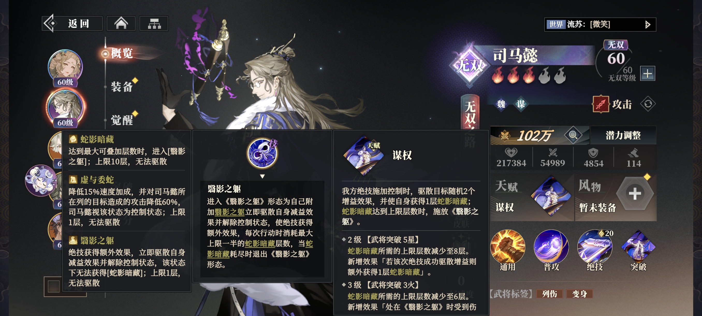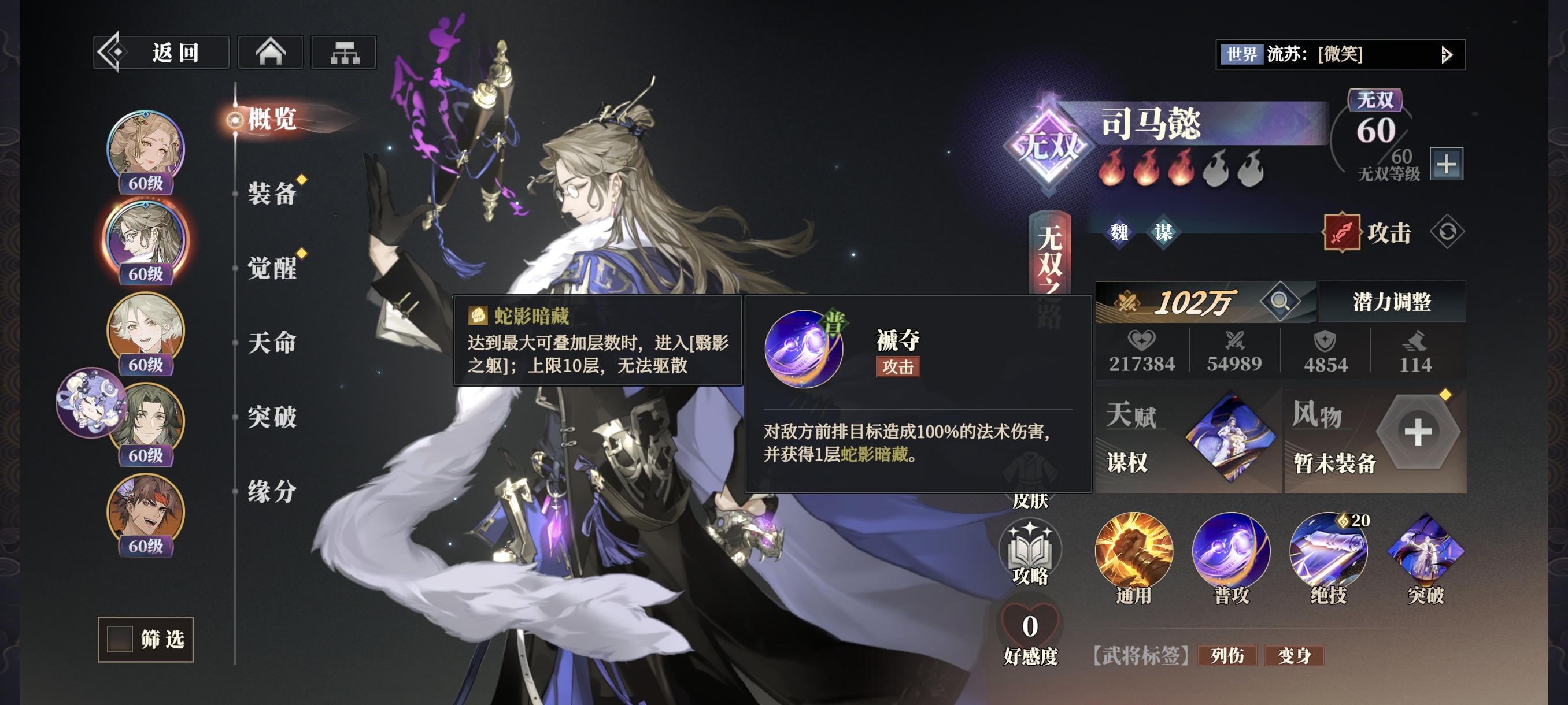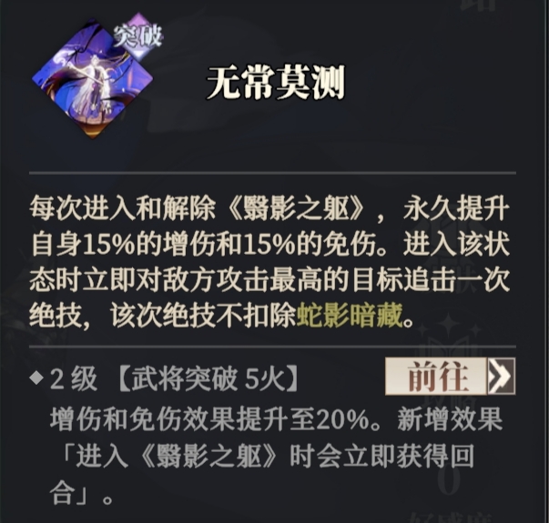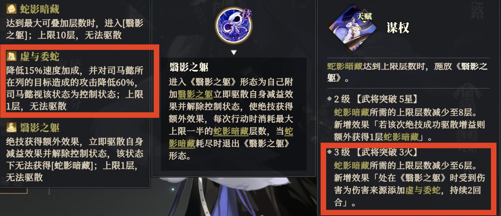 【蛇影暗藏】会随着武将升星降低上限层数,最多可降至6层。当司马懿和绝技带控制的武将同时上阵时,首次绝技命中3人叠3层,玉角鸣和追击叠1层,控制绝技叠2层,首回合即可进入变身,可大幅提前司马懿的爆发和叠层时间。