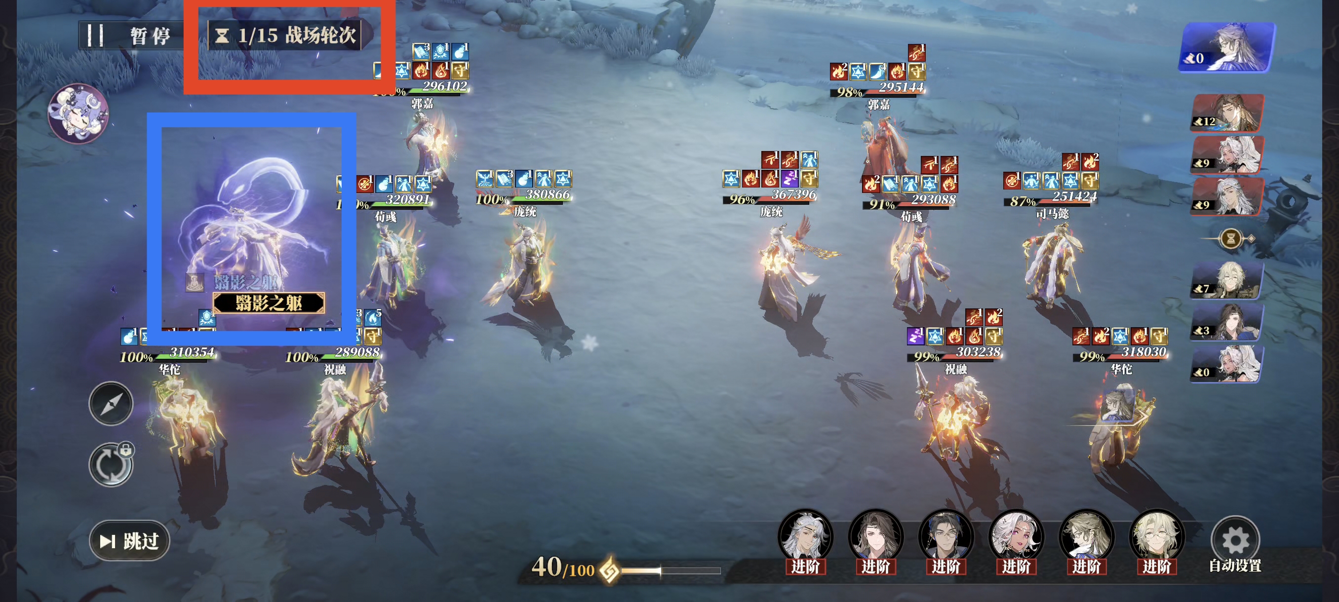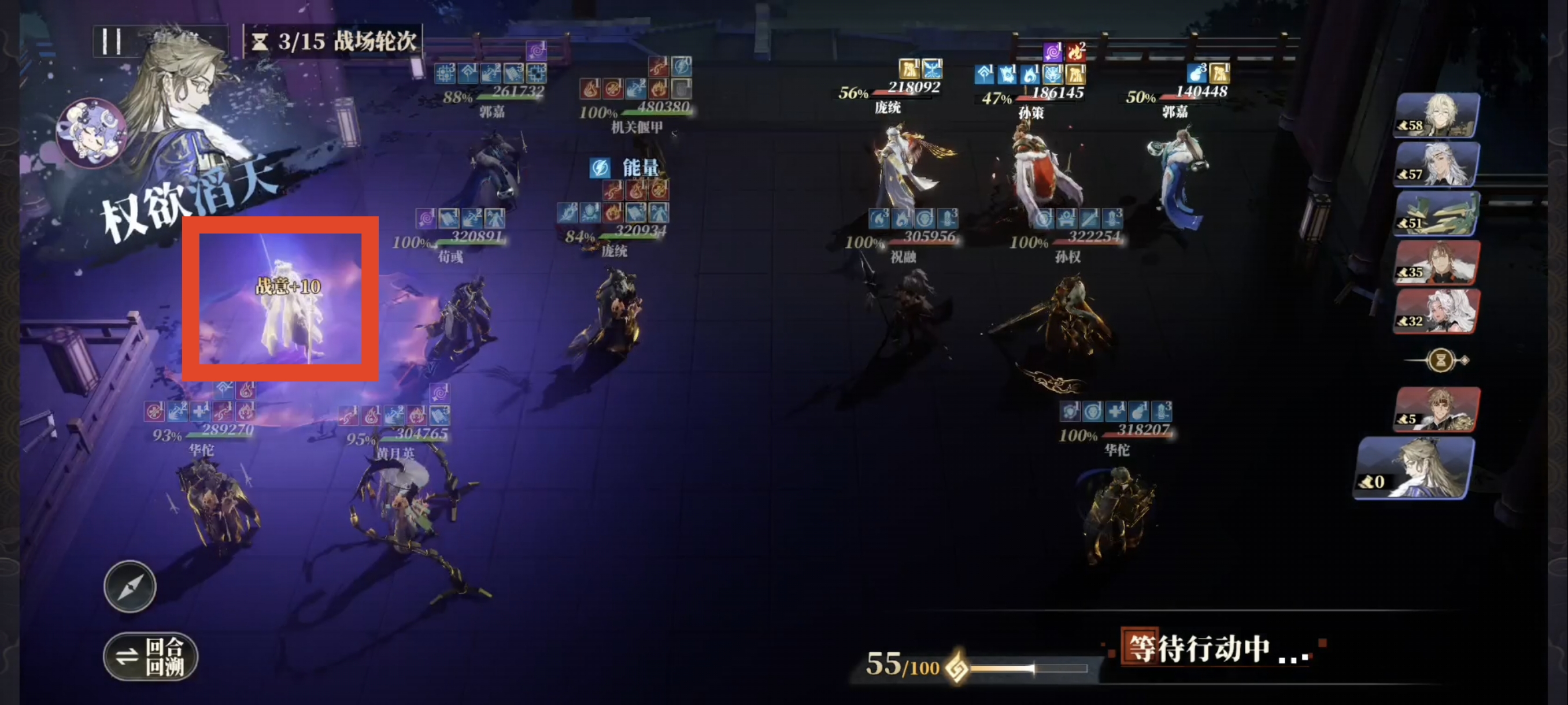 满潜能114速典型的慢速C,虽然开场行动较晚,但全场时序循环却非常快,专武和荀彧双12%不可驱散的速度加成,让司马懿的时序轮转频率很高。