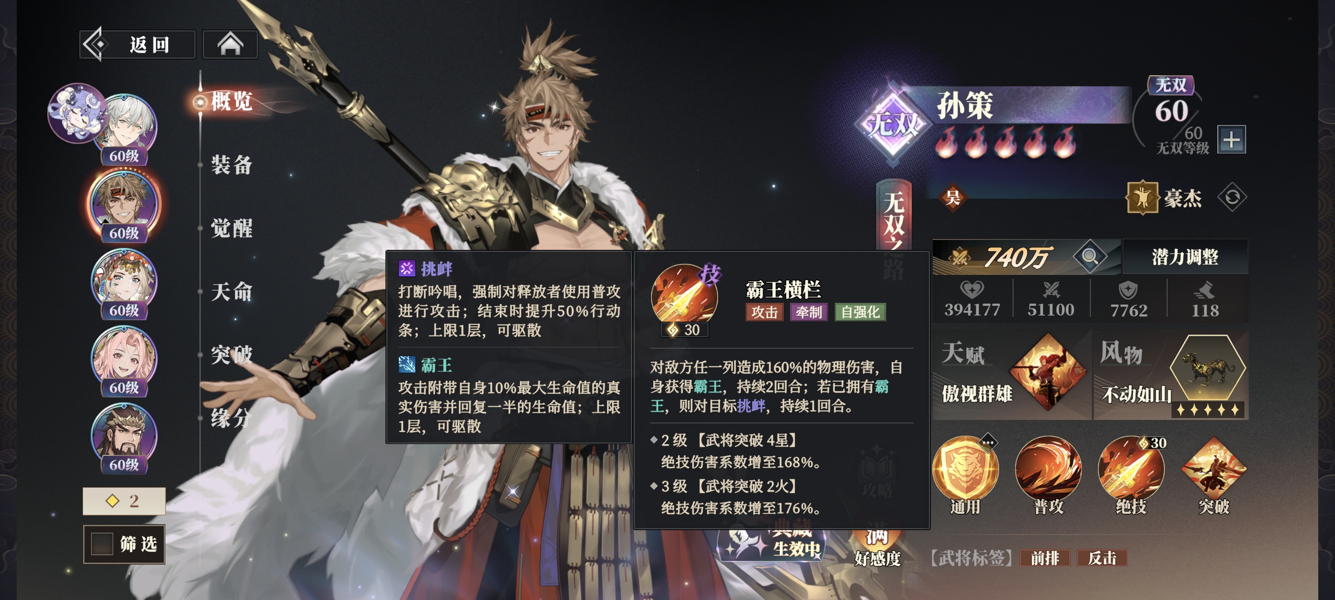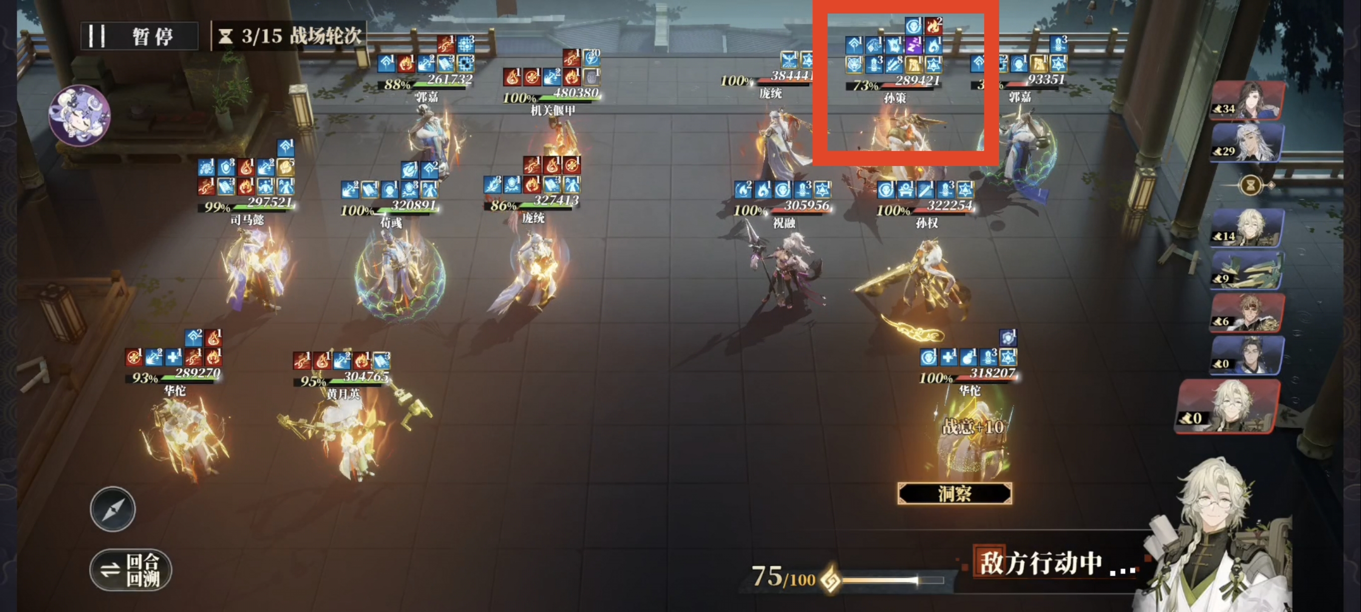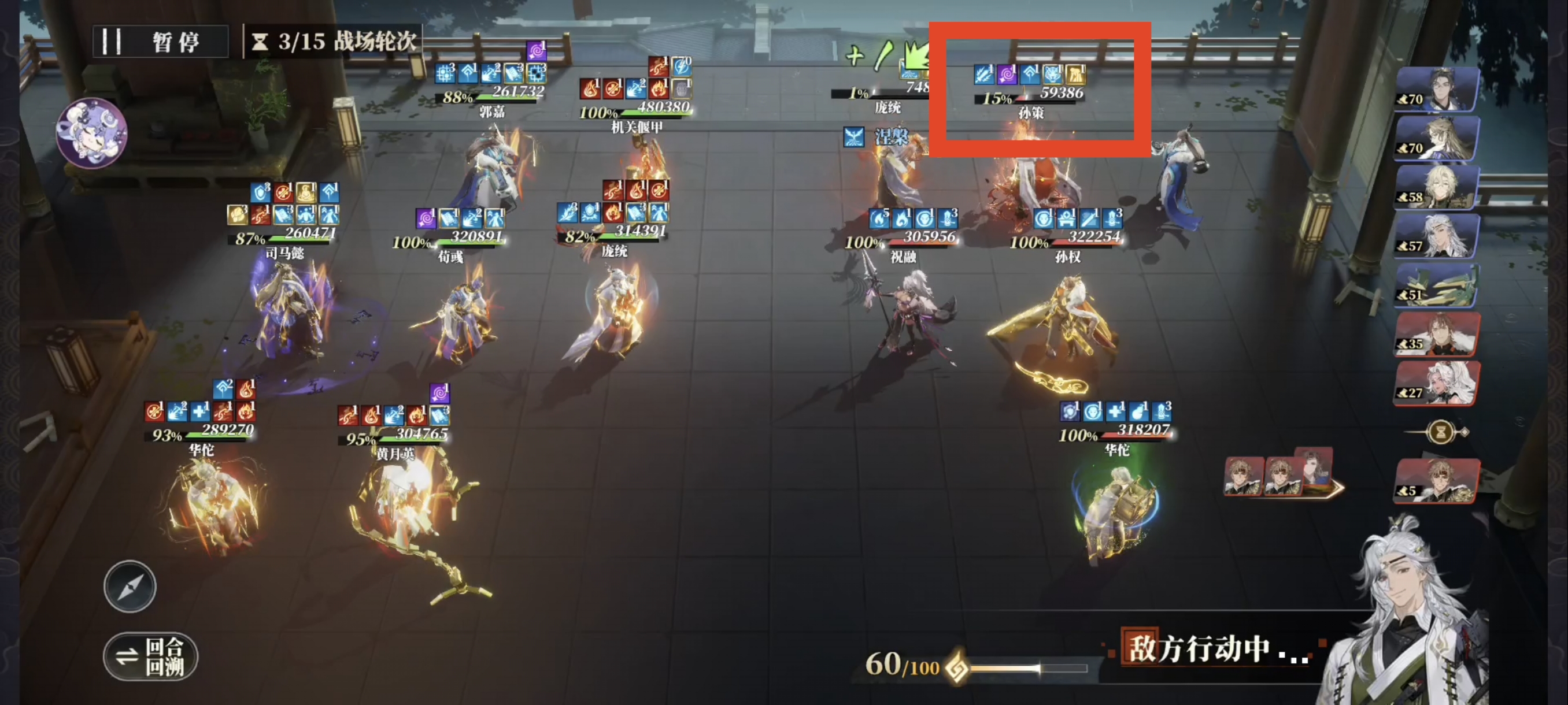 另一种就是加入孙策组成双核体系,相比司马懿谋队来说,孙策和司马懿两人各站一列更加稳定,无论是那一列受到攻击,都能为另一列争取时间,两人均有奠定胜局的能力。孙策同样是极少自带控制的绝技,与荀彧配合可以让司马懿更快更稳定的变身。两人均为列攻,司马懿可为孙策压低敌方血线,触发孙策的低血量增伤。