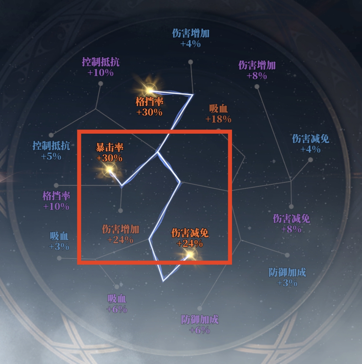 司马懿天命盘中没有橙抗控,除了最重要的暴击外,只能选择相对较好的增减伤属性,提升输出和坦度。