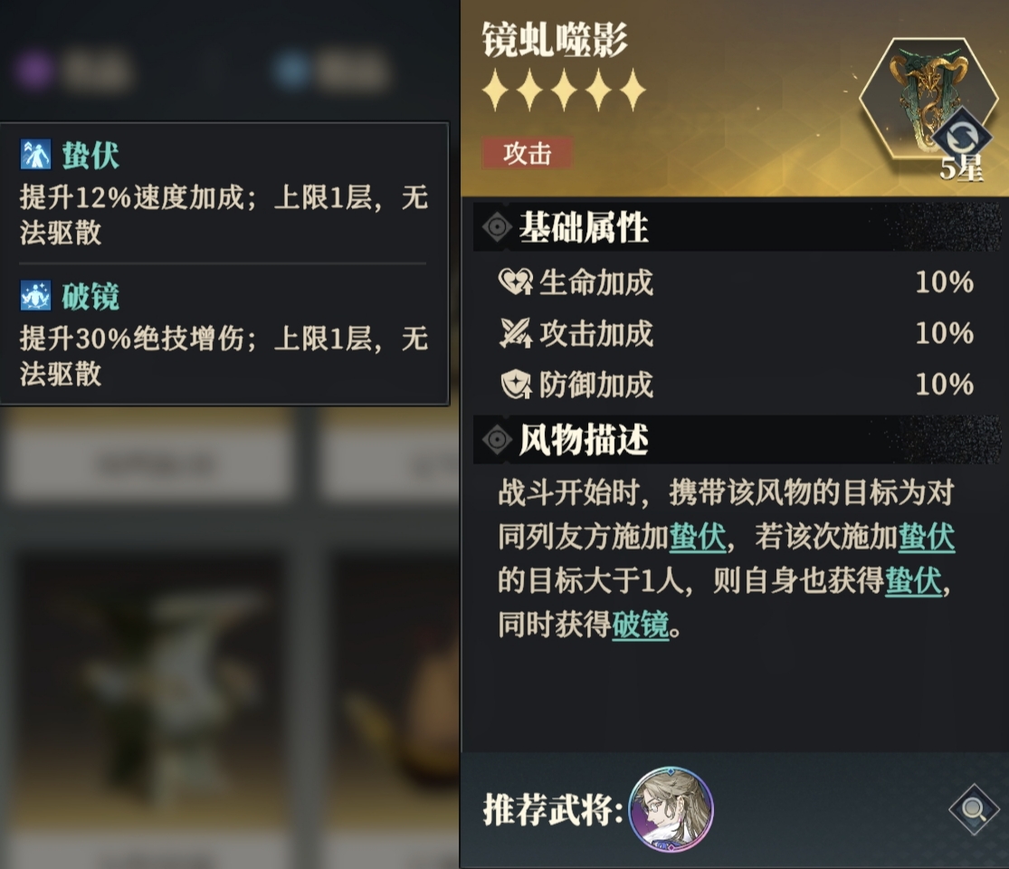 司马懿通常情况下都是与多名队友站一列的,利用【虚与委蛇】的大幅降攻起到保护队友的作用。携带镜虬噬影既能为同列队友加速,又能为自身提供绝技增伤。