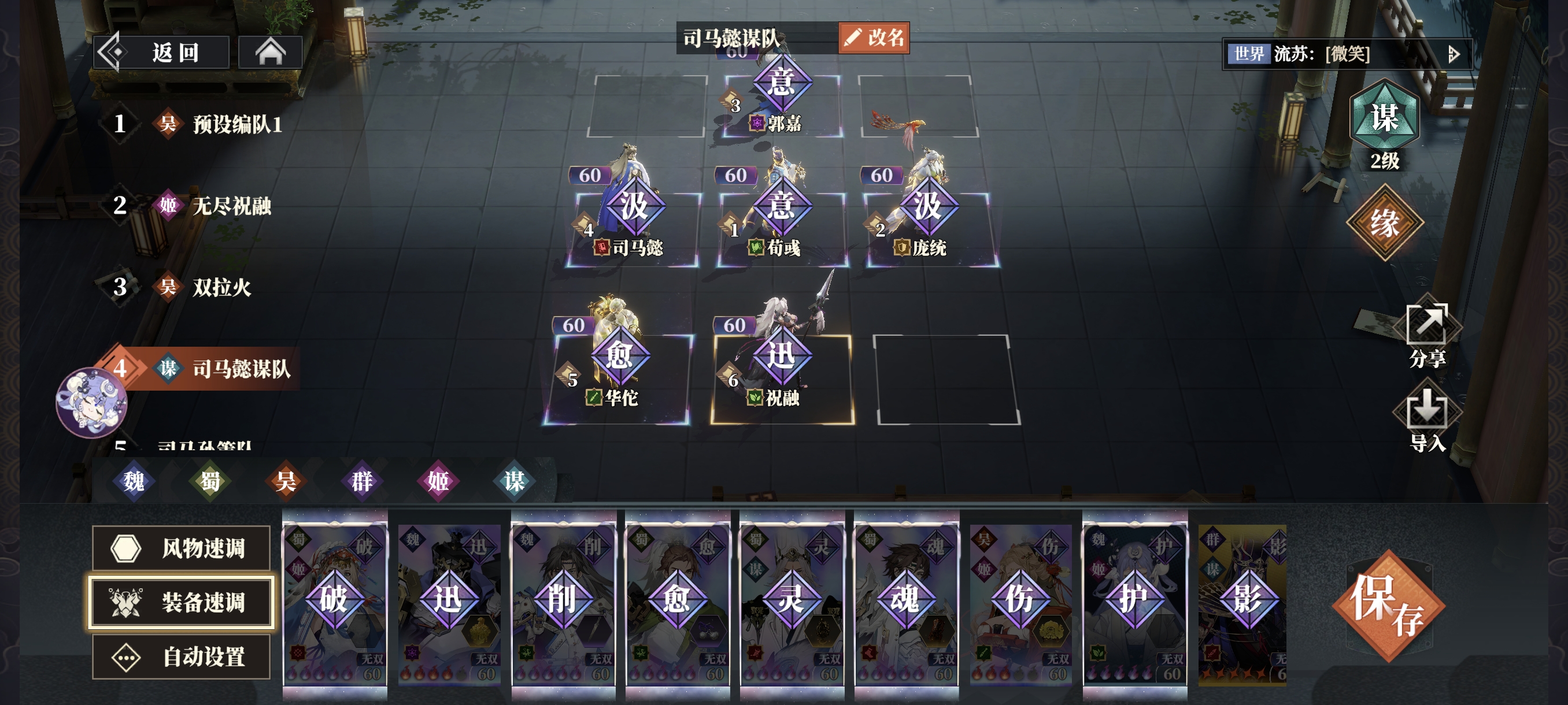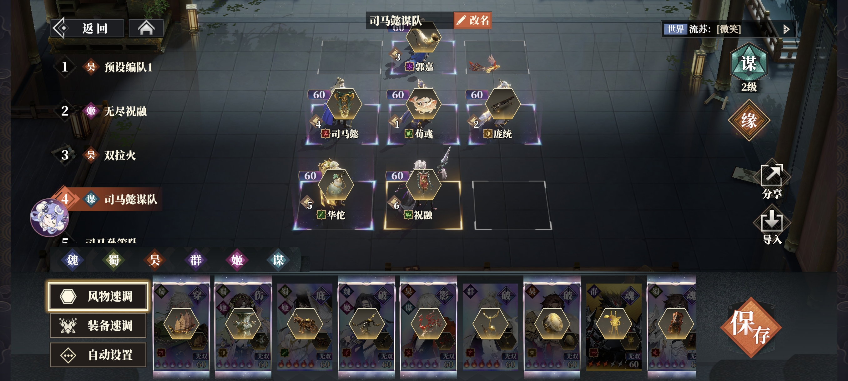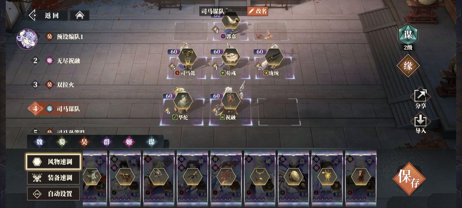 四、阵容推荐1、司马懿+荀彧+郭嘉+庞统+祝融+华佗