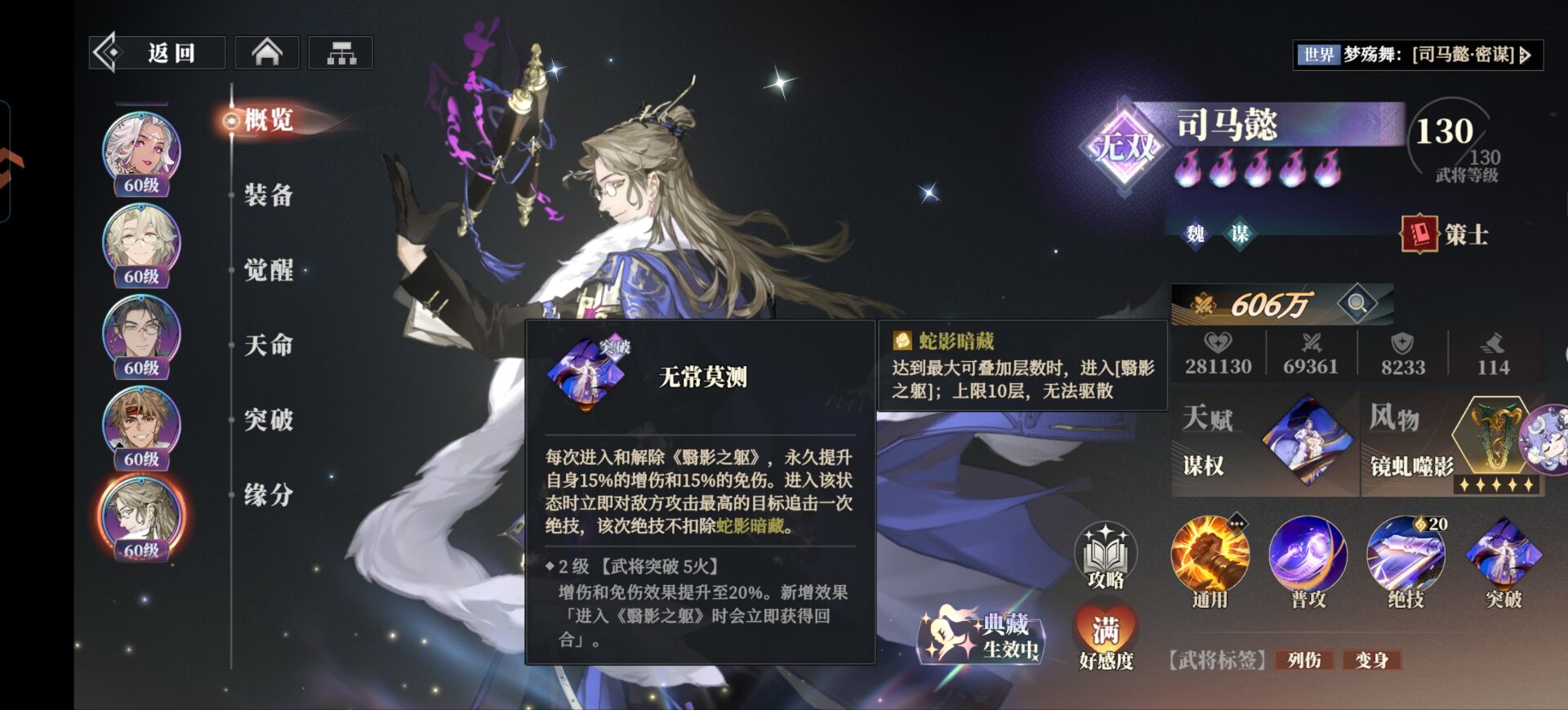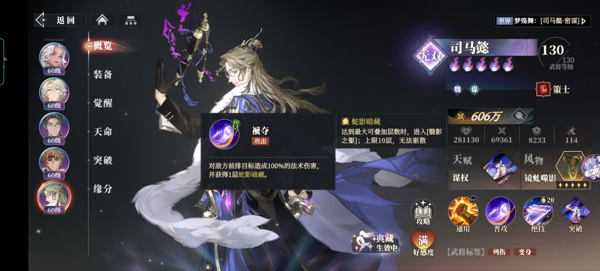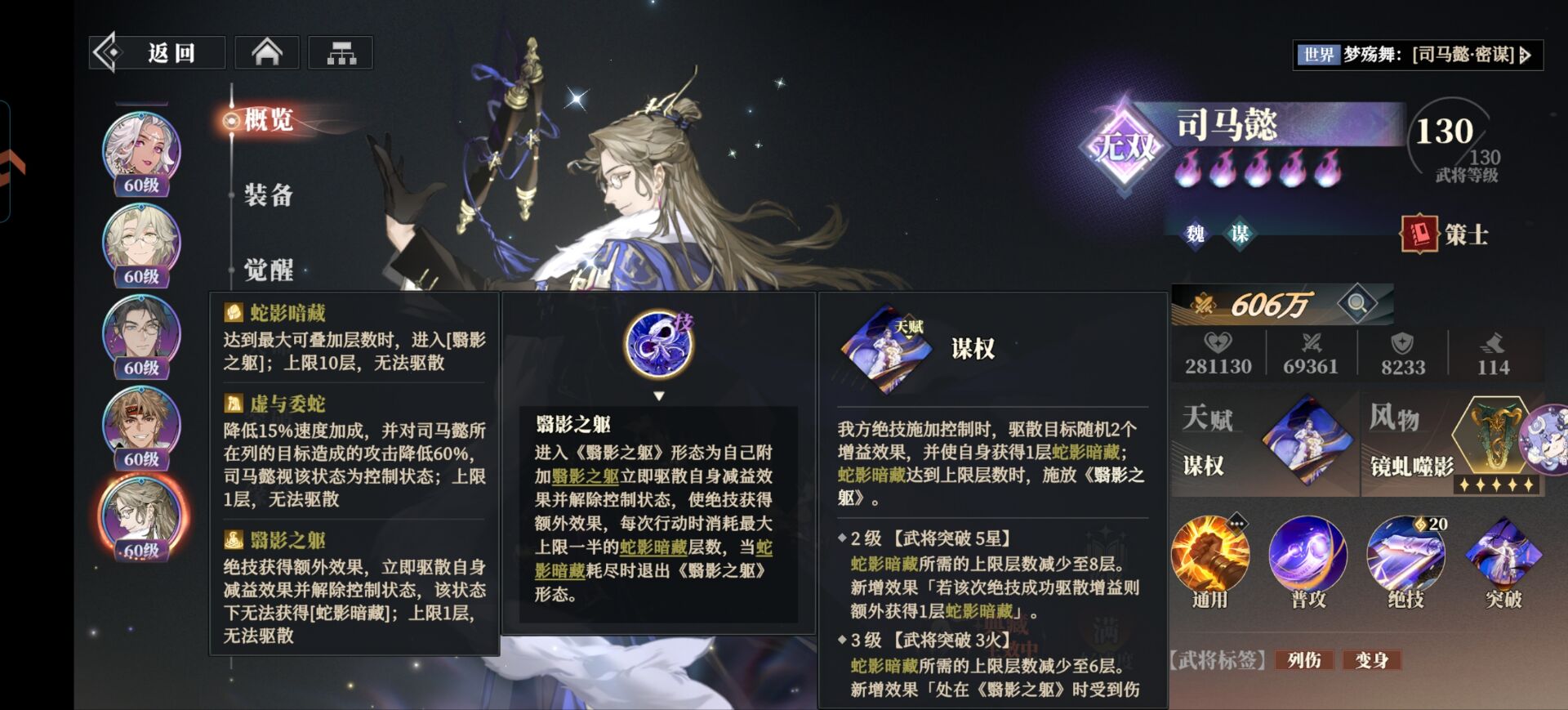 这里大家先重点注意一下【蛇影暗藏】因为是司马懿最核心的机制,当叠到10层的时候司马懿会进入到【颦影之驱】效果。