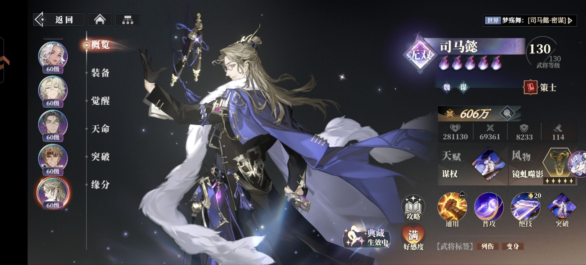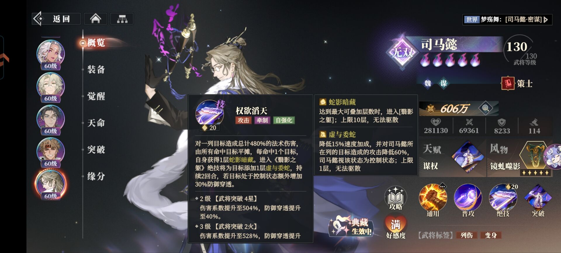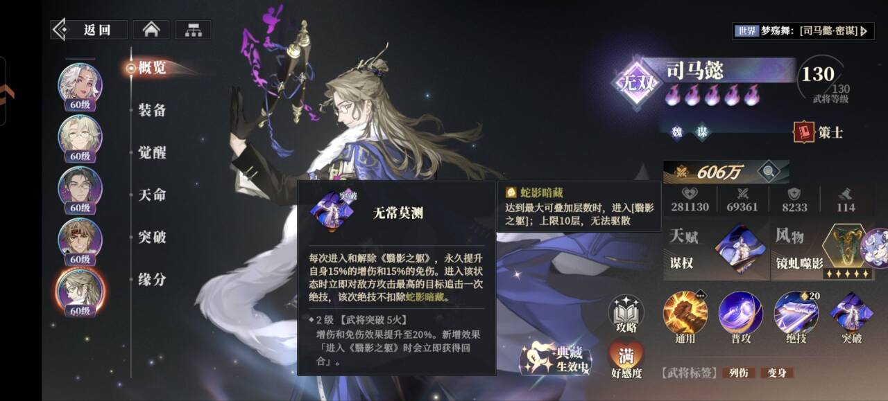 进入这个状态的司马懿会立刻驱散自身所有的减益和控制,同时可以让绝技带有《虚蛇》效果降低敌人的速度和攻击。
