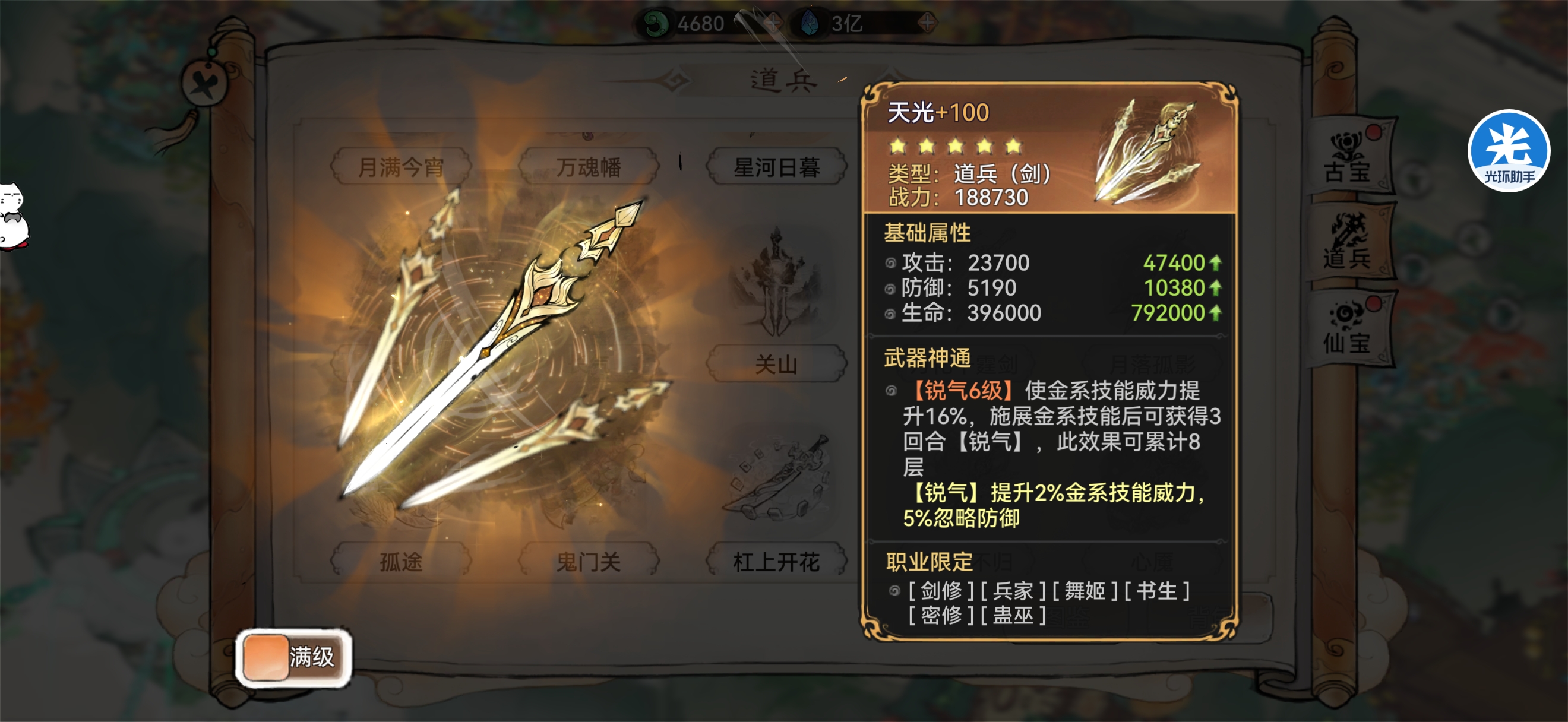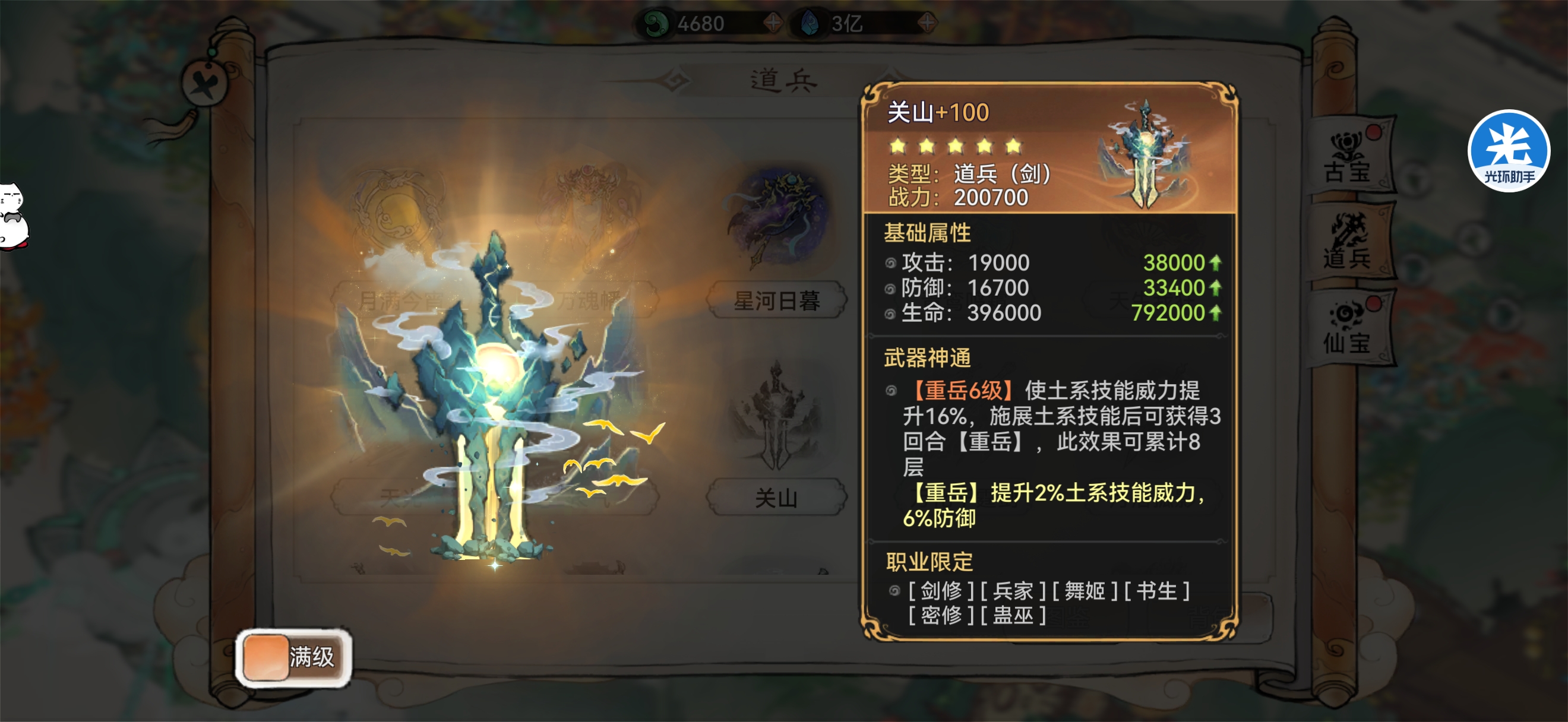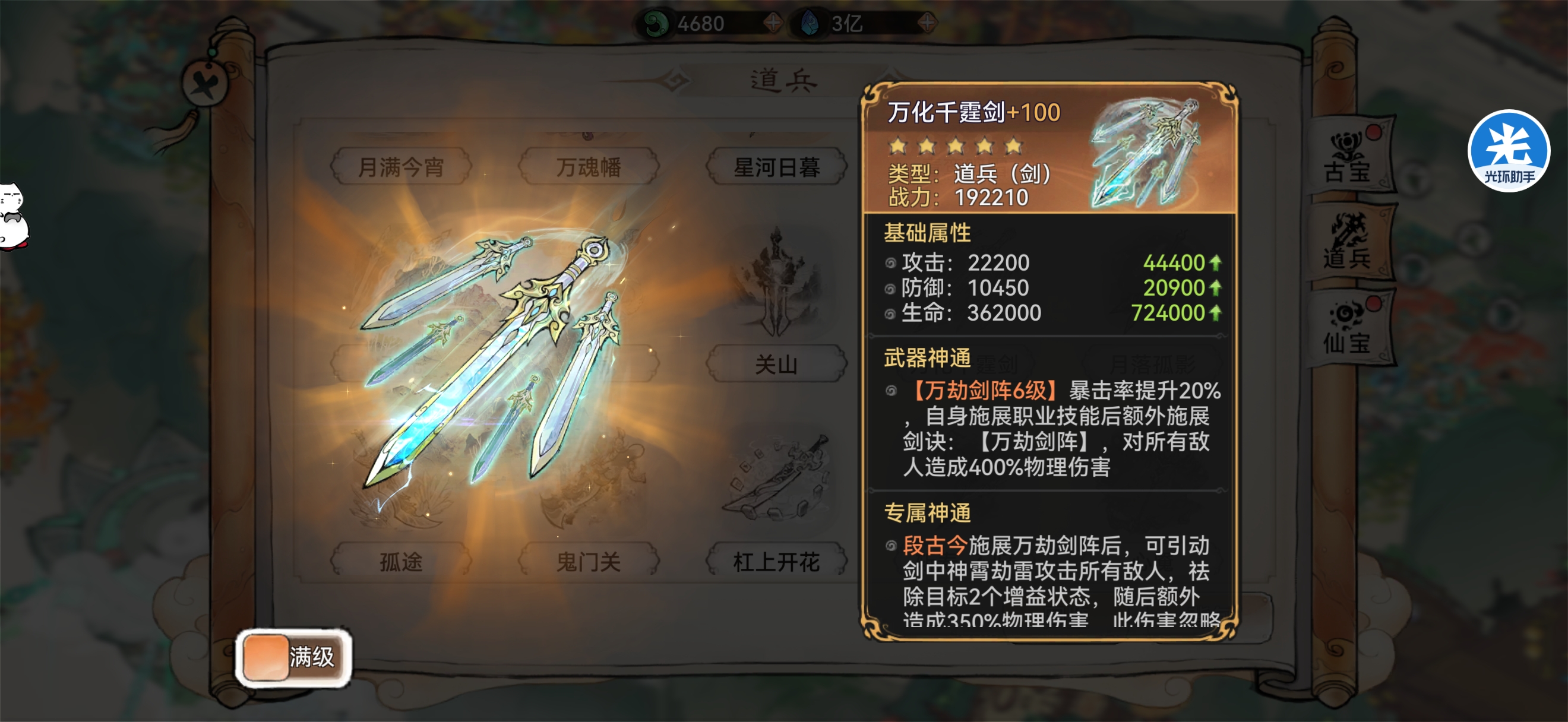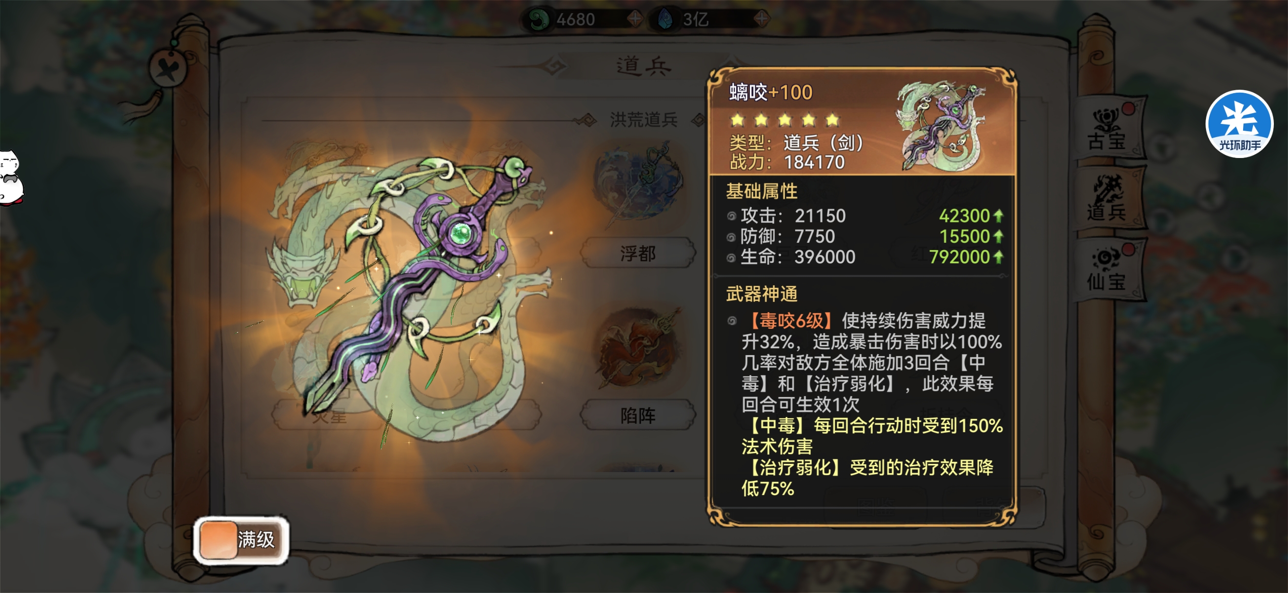 有了这把道兵韩立强度马上提升一个珠穆朗玛峰随便打出三连攻击,还有辟邪神雷可驱散敌人的增益。除了韩立、段古今以外,老李也是可以带的因为有额外的全体物理伤害,其他弟子就不太适合带了。