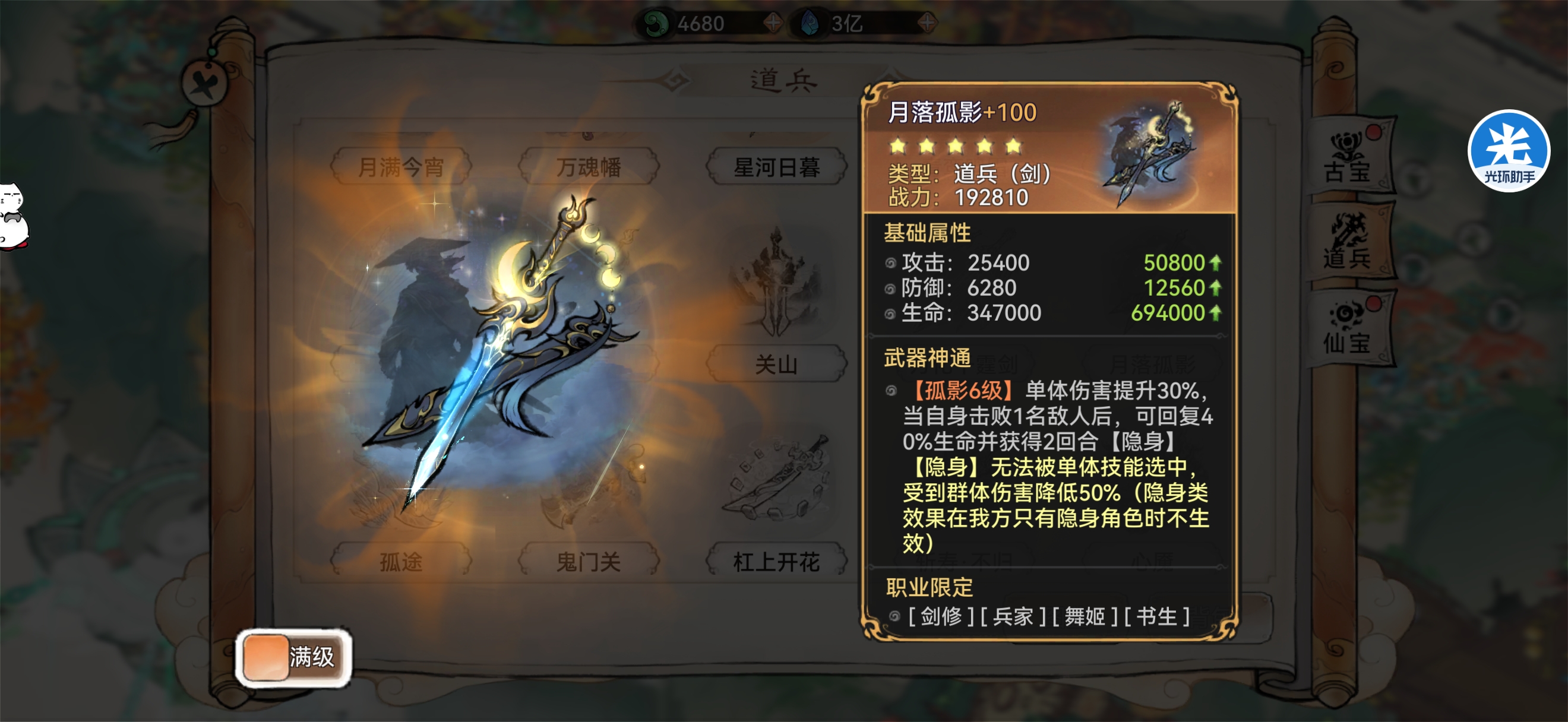 解析:月落孤影这把道兵可惜的点在于提升的是单体伤害,像韩立、龙人这种aoe伤害就非常不适合带了,因为他们🈶更好的道兵选择。