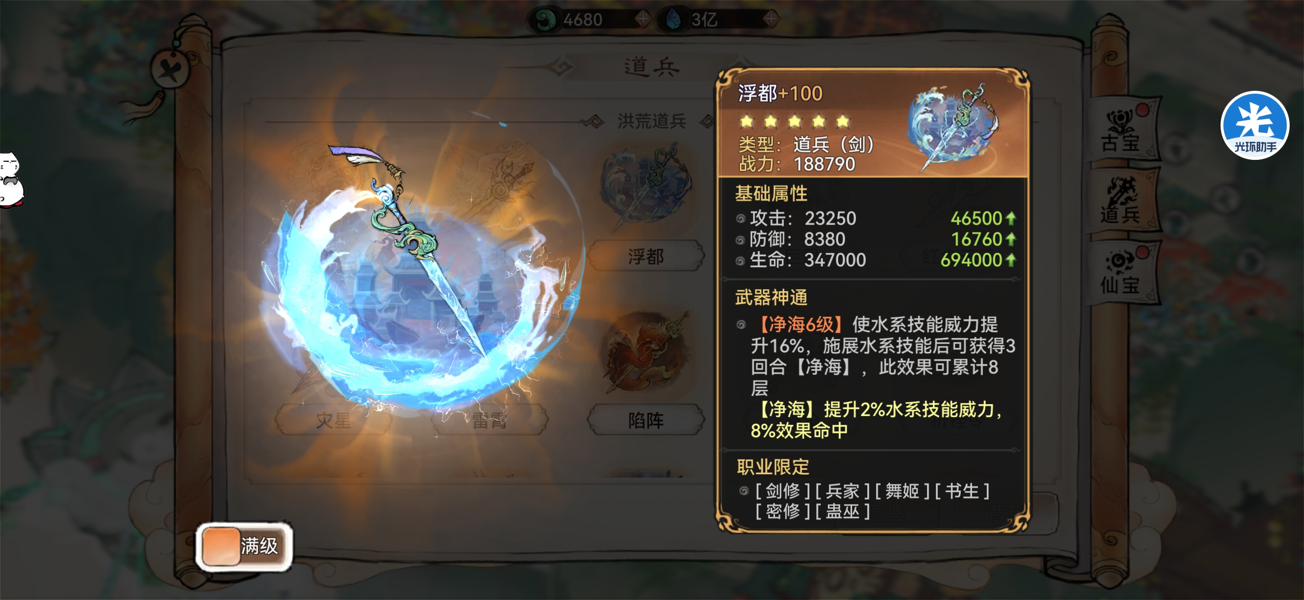 解析:浮都是五行剑之一的水剑,机制也是非常简单的就是提升水威力,非常适合高暴伤带囚龙的老李佩戴。其他都不适合带。