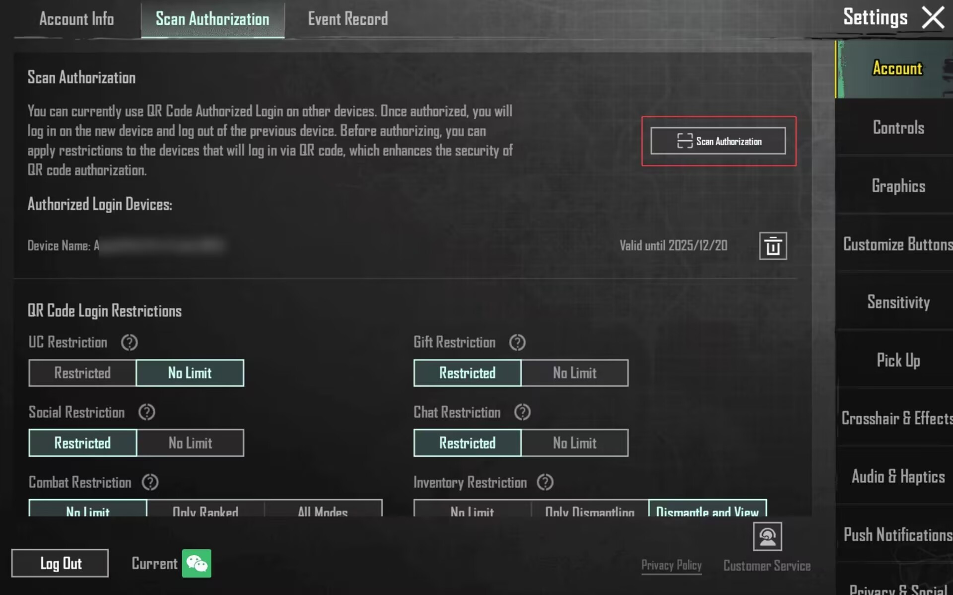 答:点击「设定」→「帐号」→「扫描二维码授权」,进入「二维码识别」页面。你可在「扫描二维码登入功能限制」介面中,限制扫描二维码登入后的使用权限,例如可针对UC、社交、对战等相关功能设定使用限制。