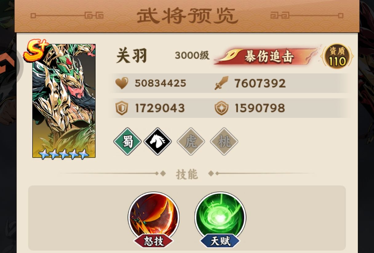 解析:关羽的优点就是伤害非常爆炸速度快和暴击暴伤高,而且击杀敌人越多暴伤叠加的就越高,最大可以叠加3层20%的暴伤加成。关羽是【狂风追击流】的核心输出角色,其在阵容的地位比张飞还重要,毕竟是主c。