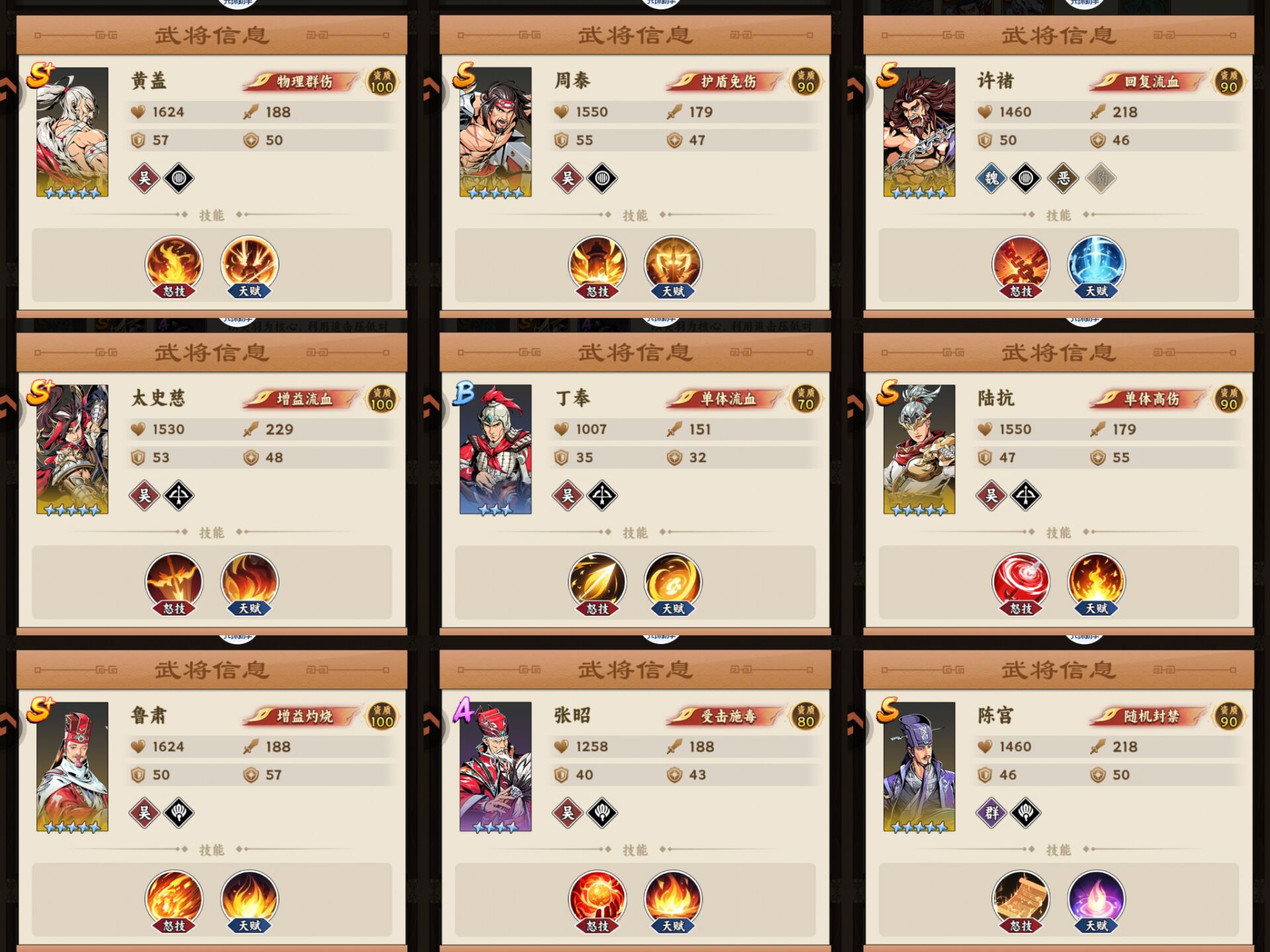 ①黄盖+周泰+许诸:三大肉盾能抗能打,还可给敌人挂灼烧和流血dot减益,同时可以激活3虎卫羁绊,进一步提升生存能力放在前排可以抗住大量的伤害。