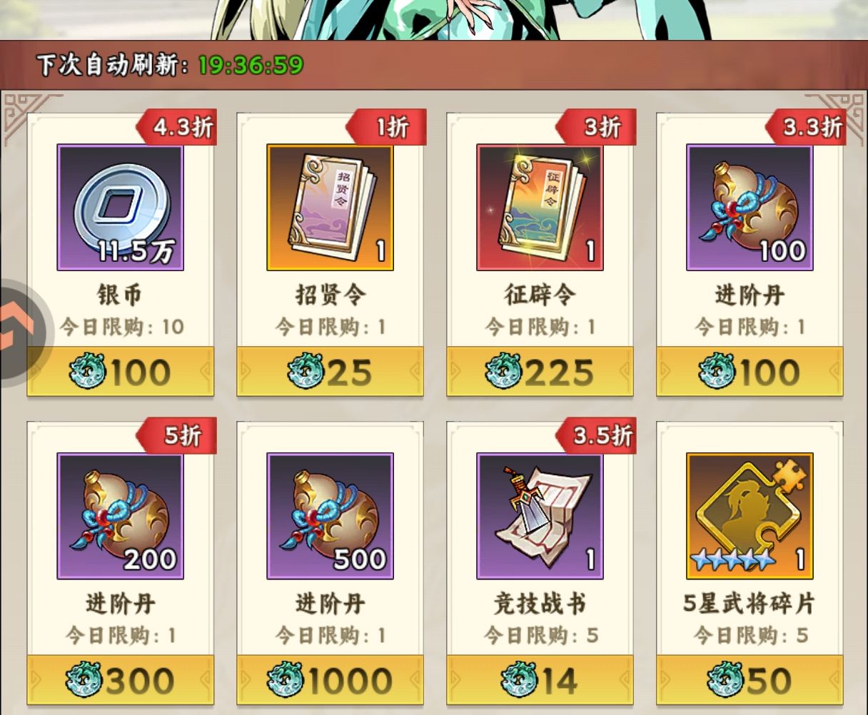 ①优先兑换:1折招贤令、3折征辟令(这两个是我们抽卡的道具,性价比很高每天都可以兑换)
