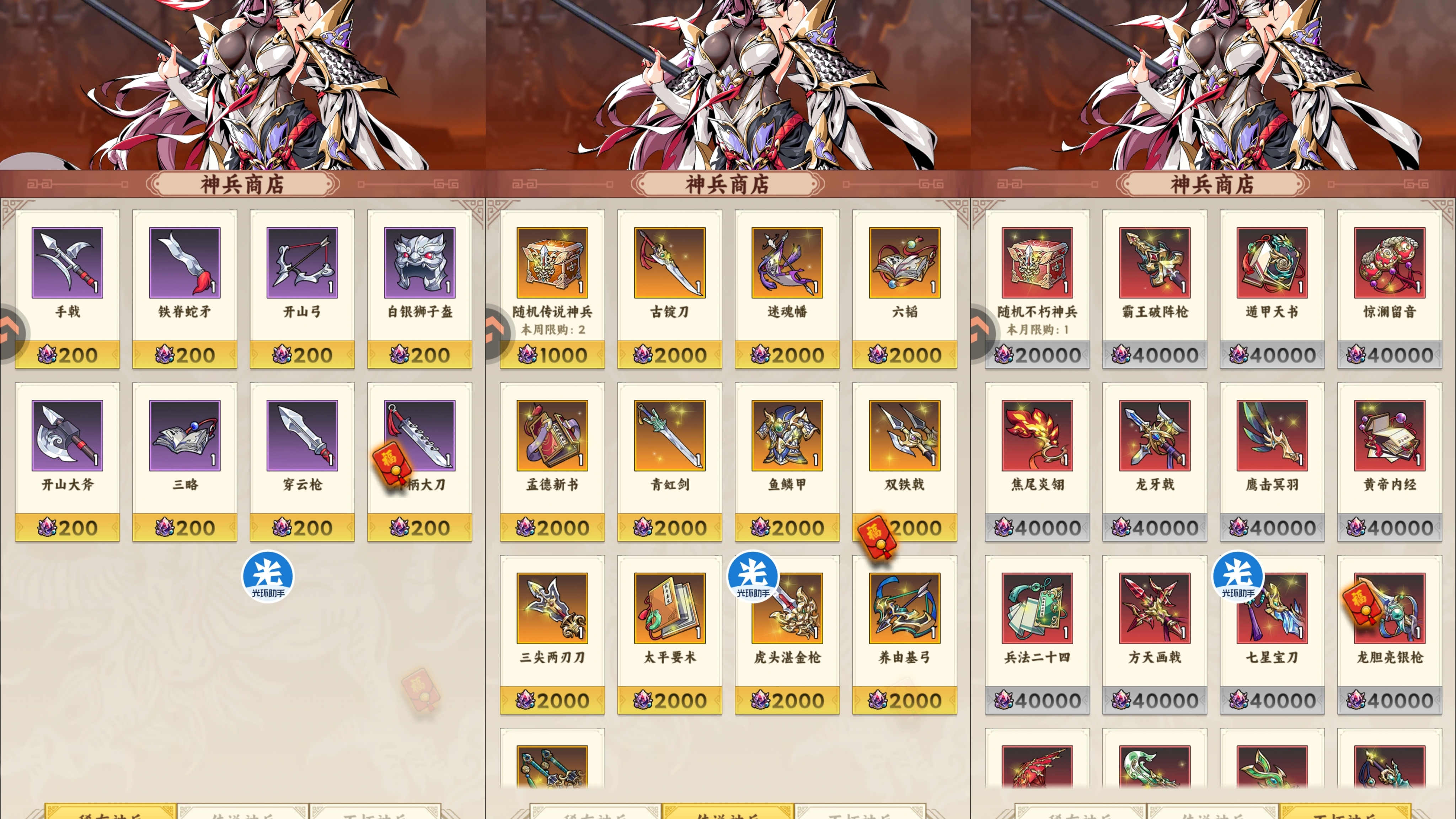 5:【神兵商店】兑换推荐。这个商店兑换思路也简单就是优先兑换自己阵容武将的核心本命神兵即可。