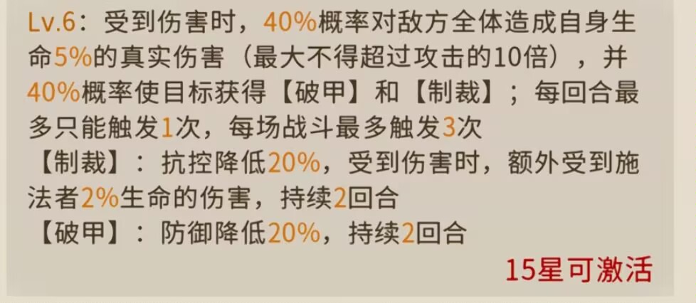 2:缺点:制裁和破甲效果可以被驱散,同时不能叠加,低星时候每场战斗只能触发1次。