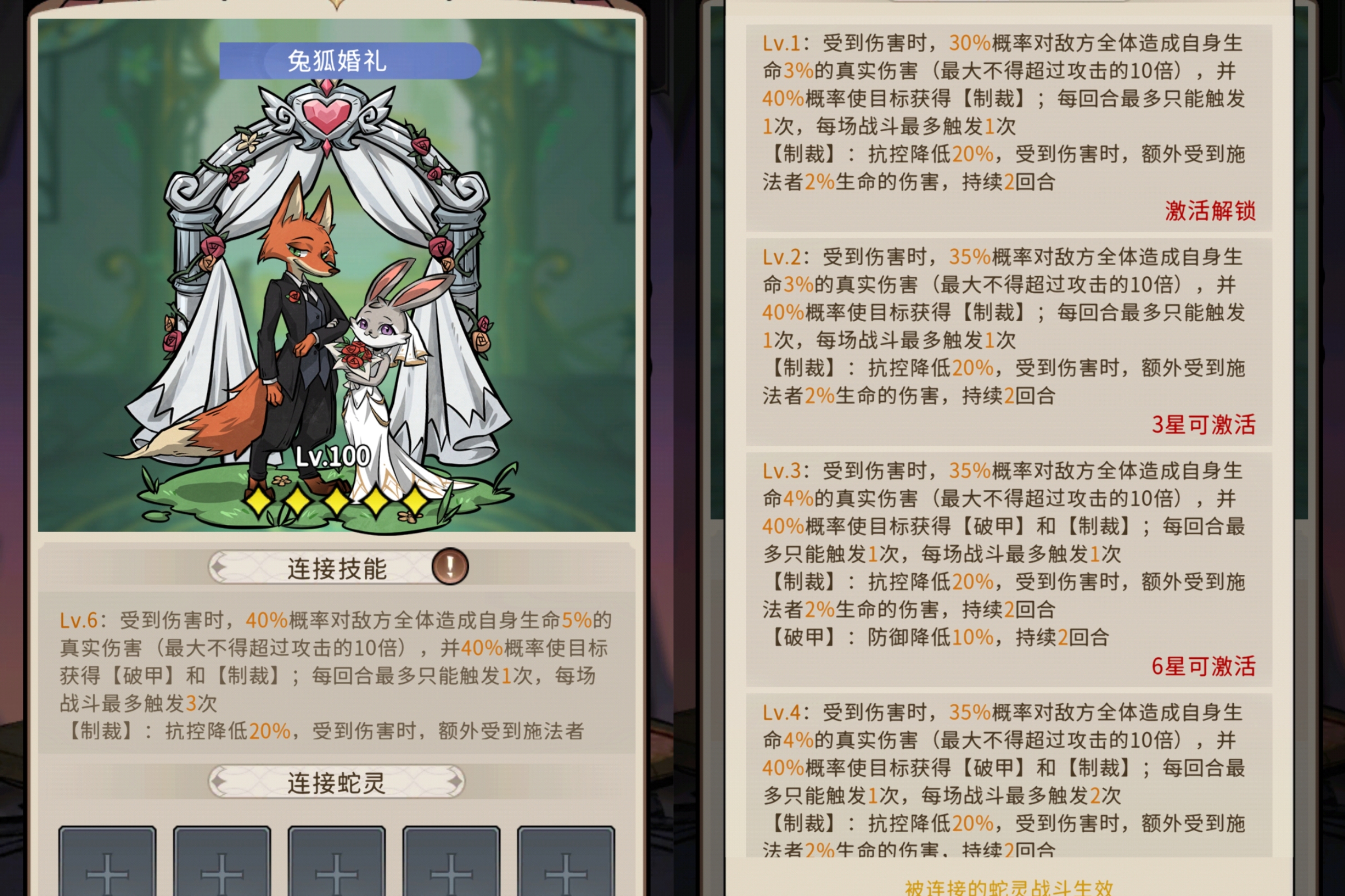 1:【兔狐婚礼】优点大总结。受到伤害可以对敌人造成基于自身生命的真伤并且这个真伤反射是可以无限触发的,比较克制一些追击能力强的角色。