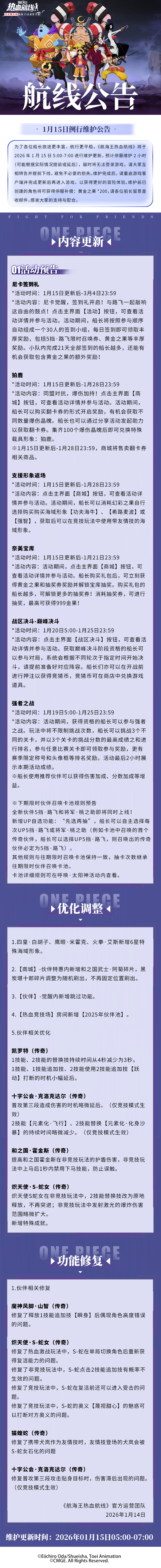 为了各位船长旅途更丰富、航行更平稳,《航海王热血航线》将于2026年1月15日5:00-7:00进行维护更新,预计停服维护2小时(可能根据实际情况提前或延后),届时将无法登录游戏,请大家互相转告并提前下线,避免不必要的损失。