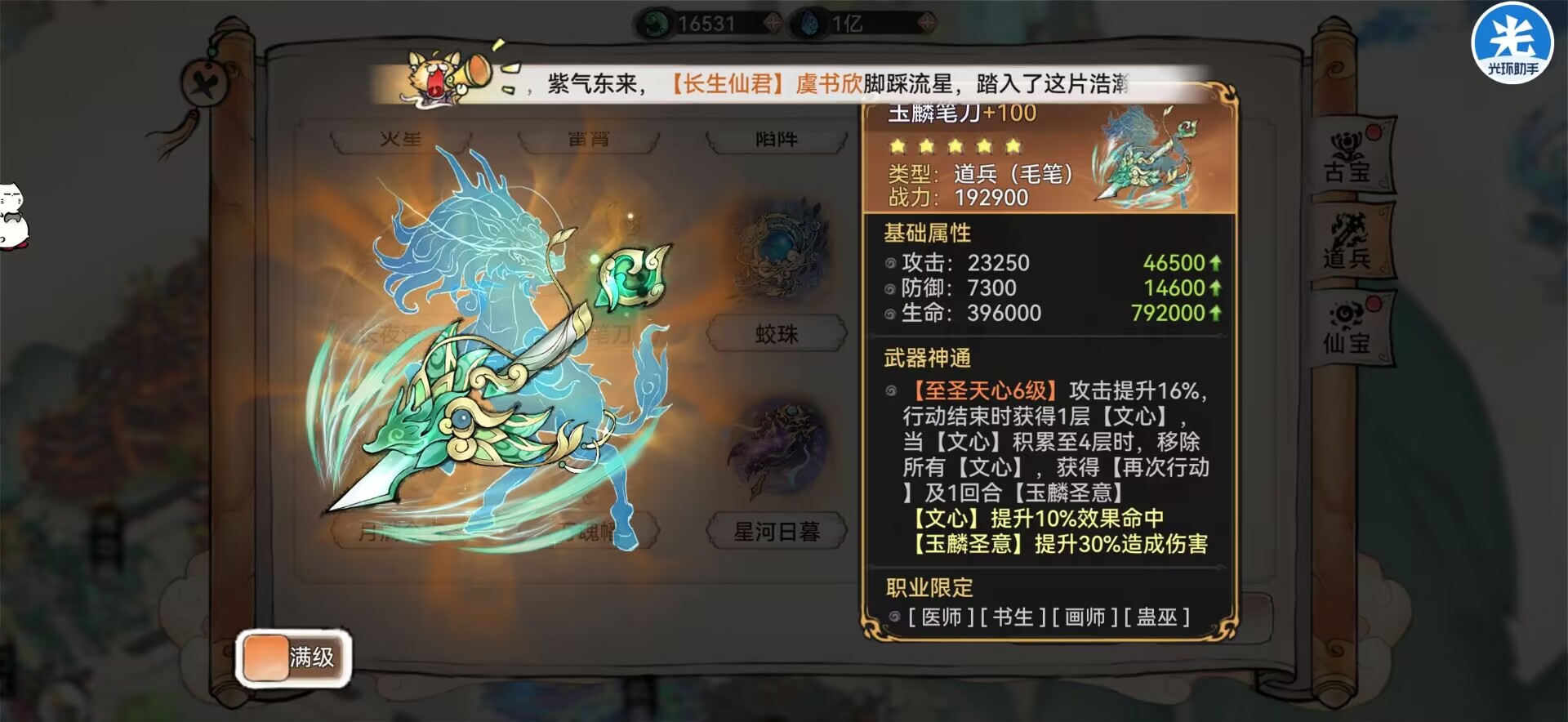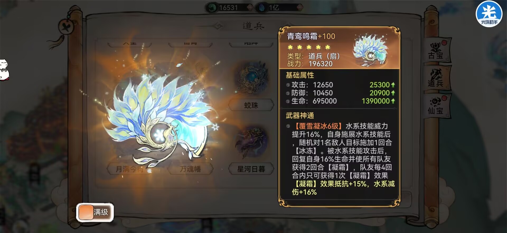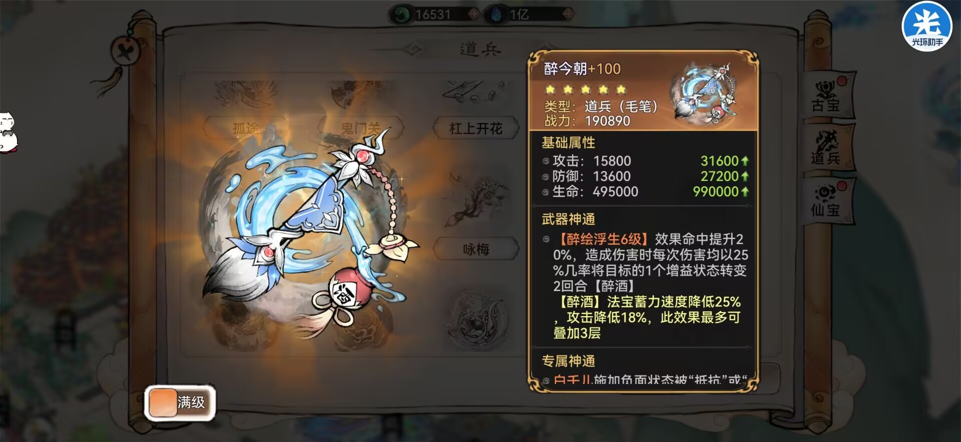 解析:这把道兵只适配白千儿提升的是效果命中效果是可以将敌人的增益转换为【醉酒】从而降低敌人的大量的法宝蓄力和攻击力。